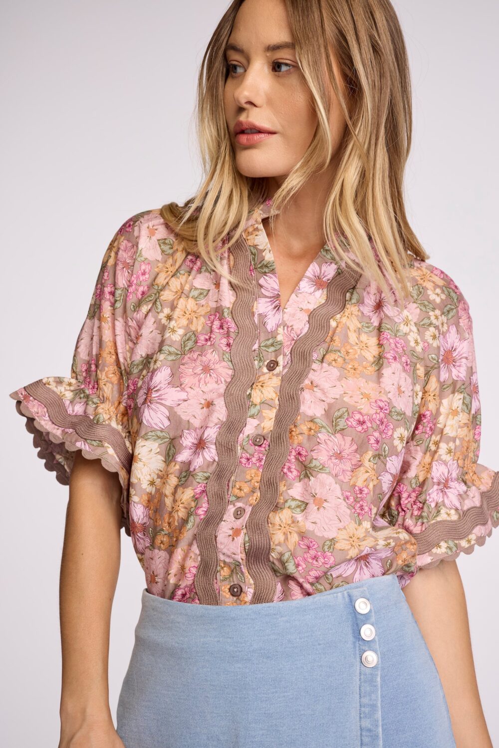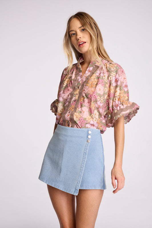 Meet Aelin, the feminine sister to the best-selling Hazel shirt. Made in a lux printed cotton silk, Aelin has an ultra-soft handfeel and beautiful drape. Featuring a contrast ric-rak trim detail, ruffle collar, and flounced sleeve, this is the perfect ultra-feminine shirt.