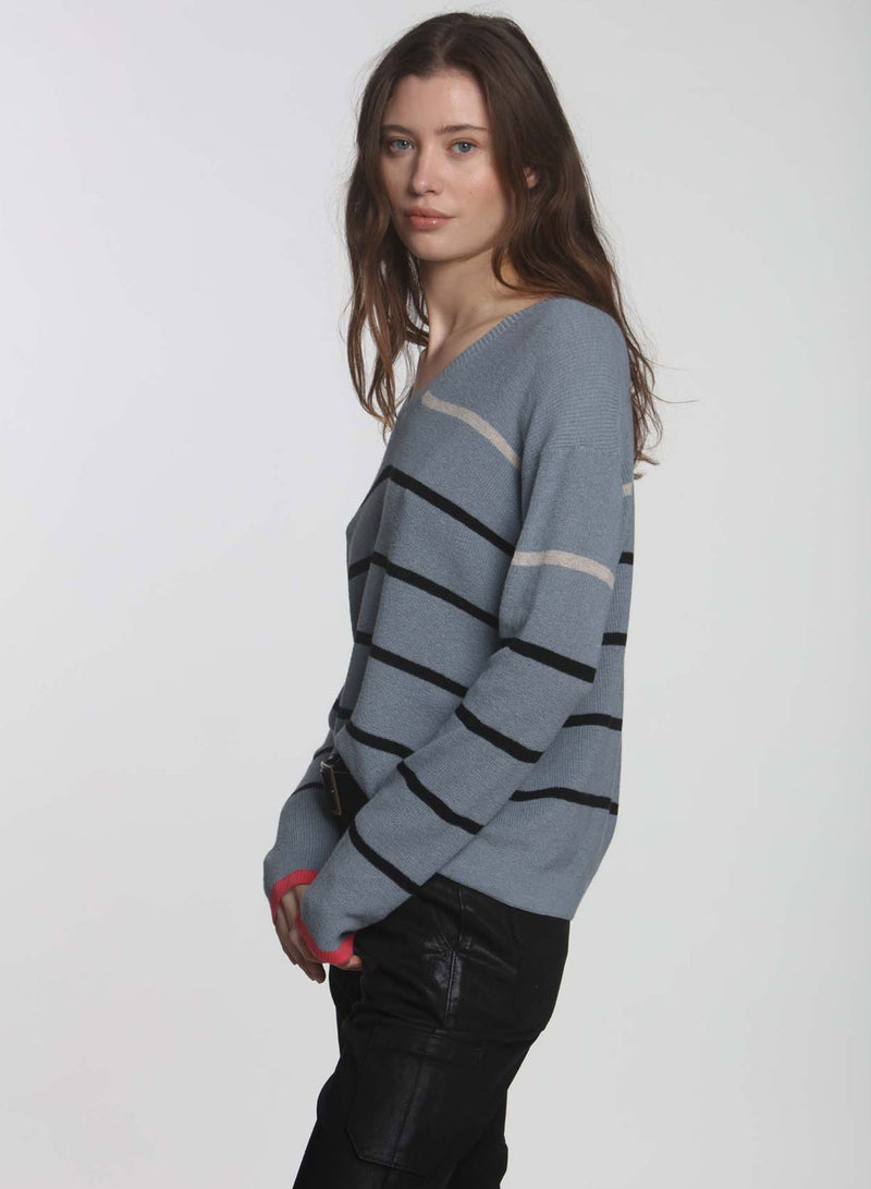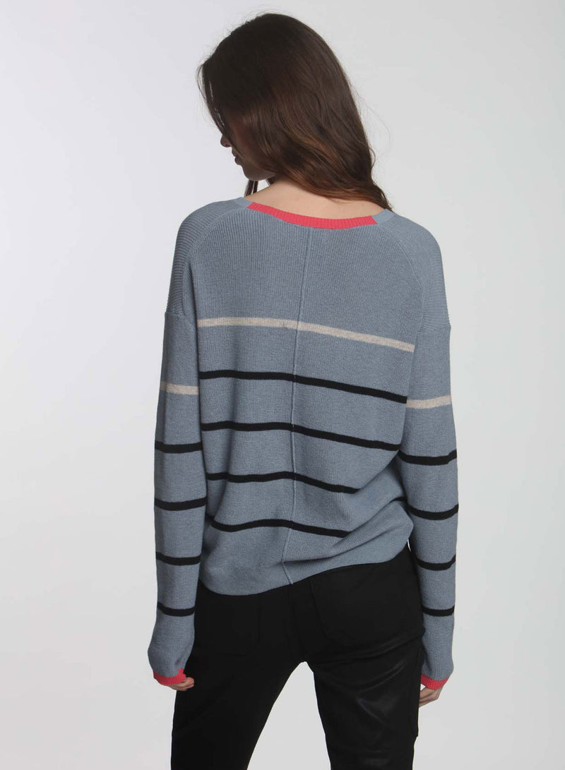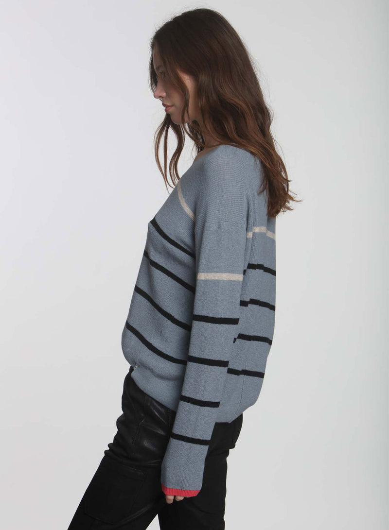 The Ainsley Stripe is a ribbed sweater in cotton cashmere blend with a loose and generous fit, making it a perfect top to wear with denim or cargos. Half tuck it with a belt or wear as a tunic over skinny bottoms. Side seams are forward-pitched with mismatched bottom ribs. Slits at the sides and a contrast neck and cuff rib, are all details that make this a fun option for a weekend brunch.