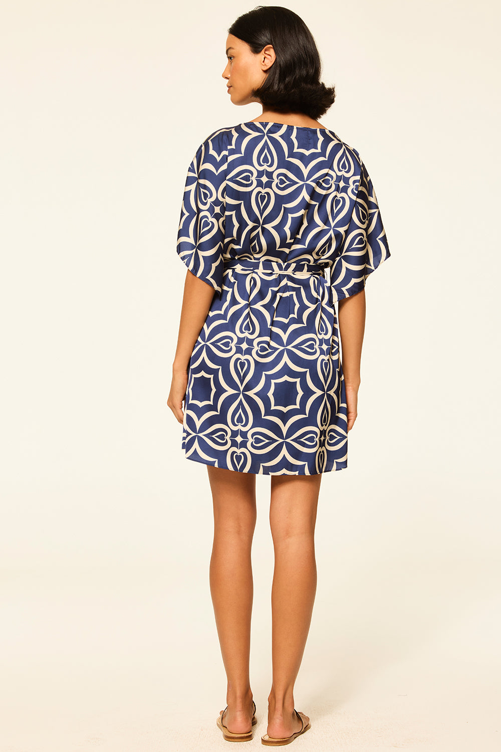 The Aleka dress is a chic new mini silhouette cut from silky Navy Mosaic Tile–printed satin. Designed with a relaxed boat neckline and wide kimono-style sleeves, it features a removable self-tie belt that allows for versatile styling—wear it cinched or loose. Effortless and elevated, it pairs perfectly with sandals for a polished daytime look or dressed up with heels for an evening out.