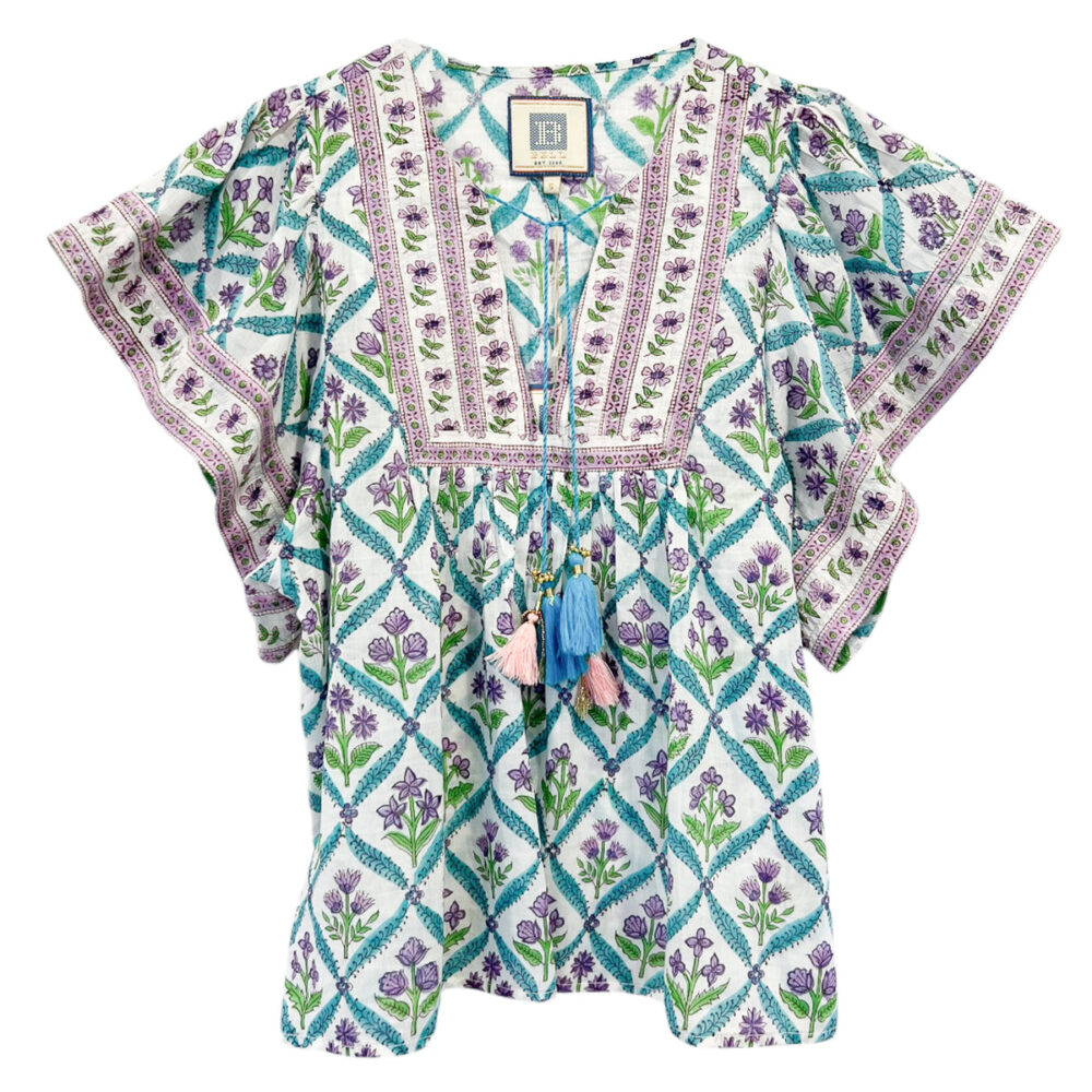 Silk cotton voile hand block flutter sleeve top with tassel detailing.