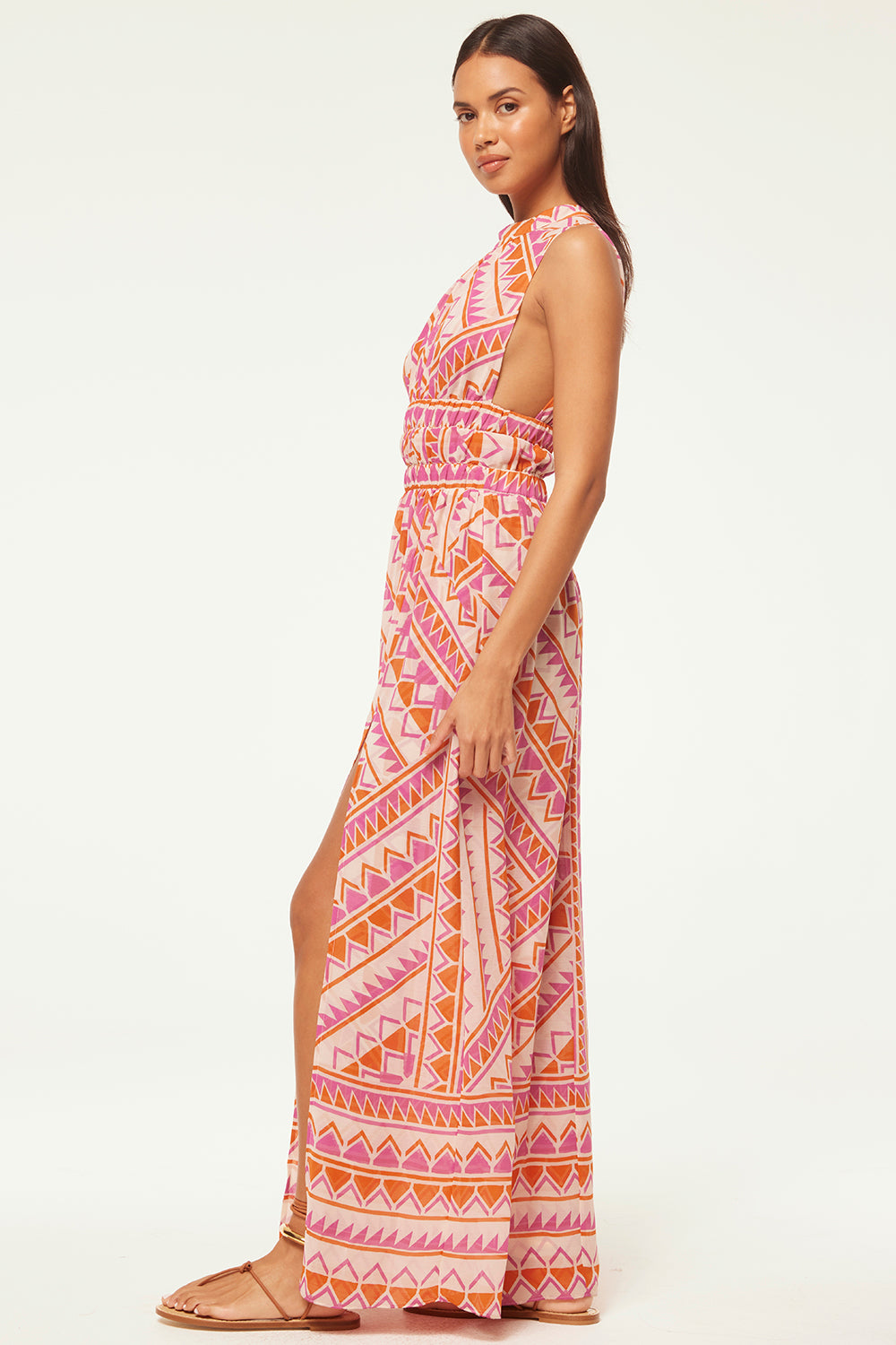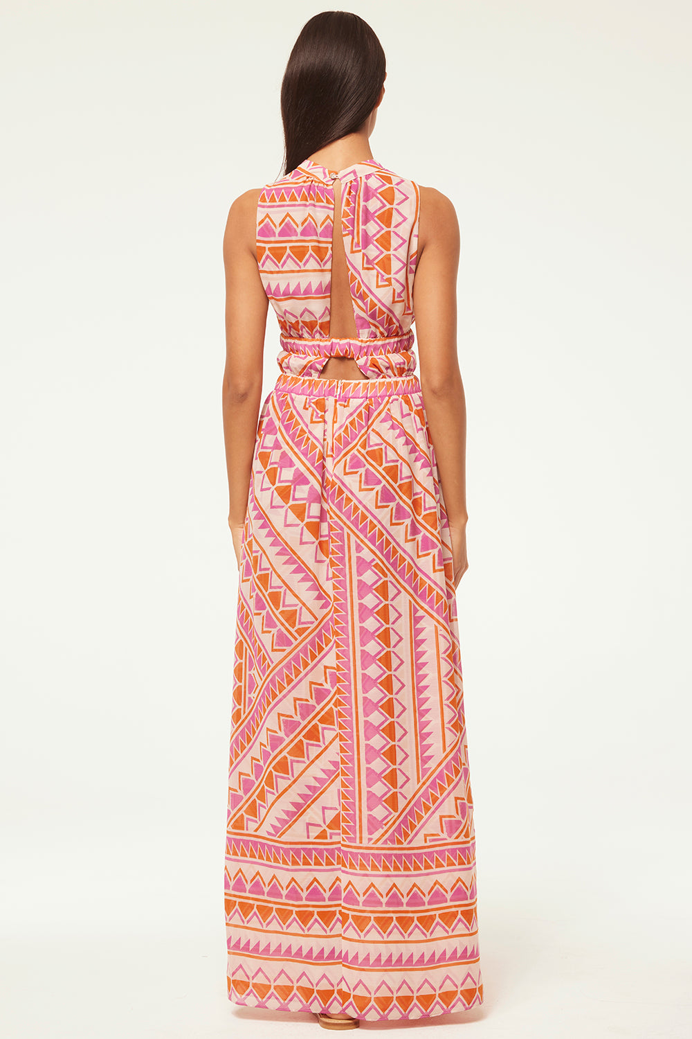 Aranita is the perfect event-ready silhouette for all your Summer soirées. This sleeveless maxi dress is cut from Misa’s Aperol Geo print chiffon and features a high banded neckline and ruched bodice with wide arm openings and a large keyhole button back. A wide smocked waistband leads into a flowing skirt with dramatic front slit. Hidden back zip closure.