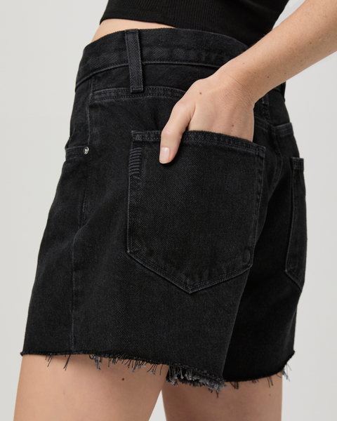 Archie is a vintage-inspired high rise denim short with a slightly longer 4 1/2″ inseam. This pair is cut from super soft denim with a hint of stretch for comfort in a faded black wash with a distressed hem and vintage silver hardware.