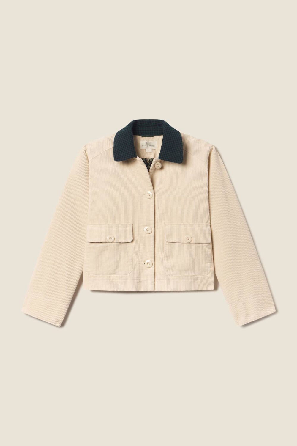 The Atlas Jacket is a cropped chore jacket in soft cotton twill. Paired with petersham ribbon detail throughout, signature antique white buttons and large front patch pockets with buttoned closures. Shown here in Oat Corduroy and made from cotton.