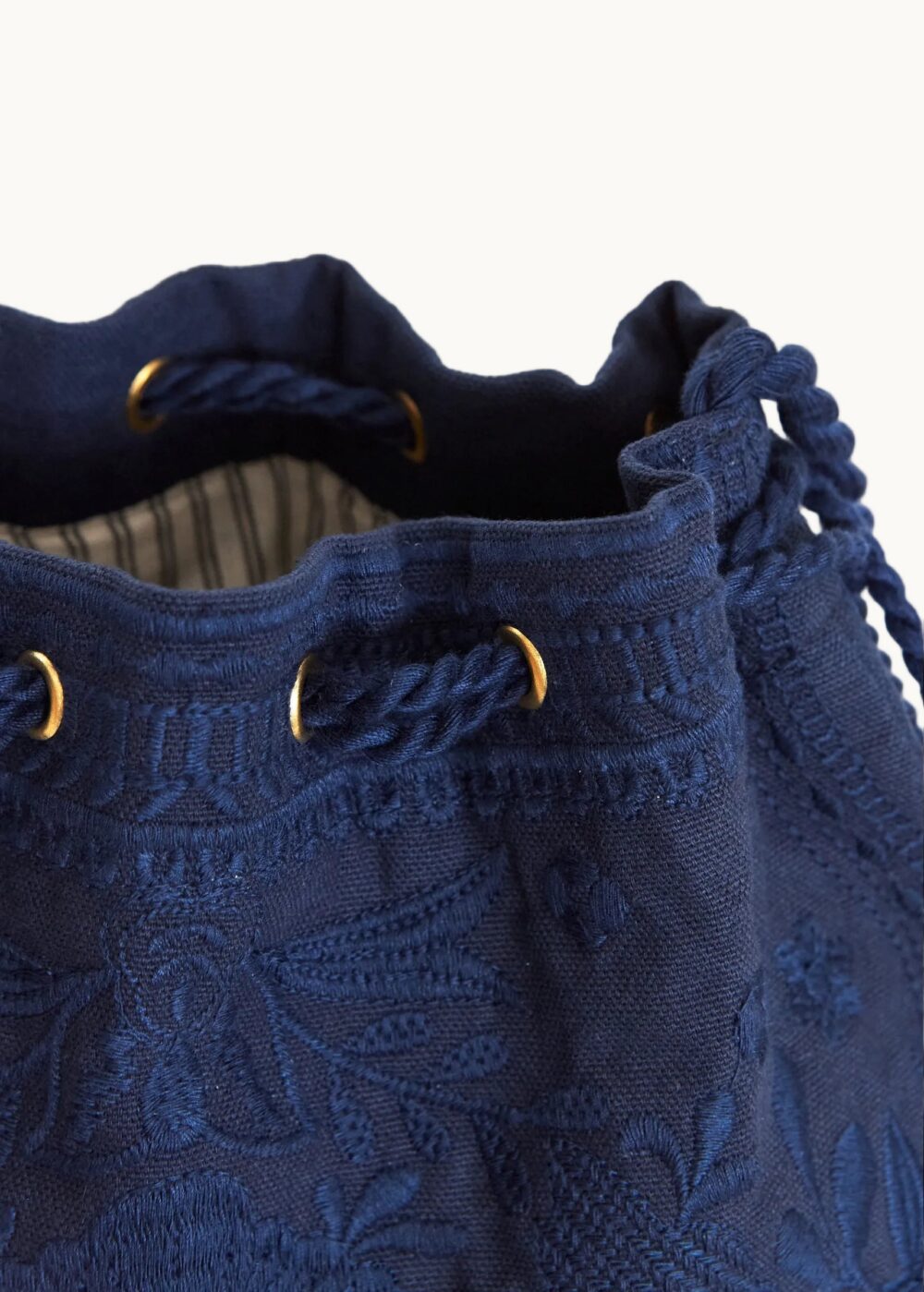 The Averi pouch is designed with Subtle floral and border embroidery. Detailed with lace-inspired accents, a woven striped lining, and an adjustable cord, it combines practical crossbody functionality with refined, artisanal elegance. Ideal for carrying essentials with relaxed summer sophistication.