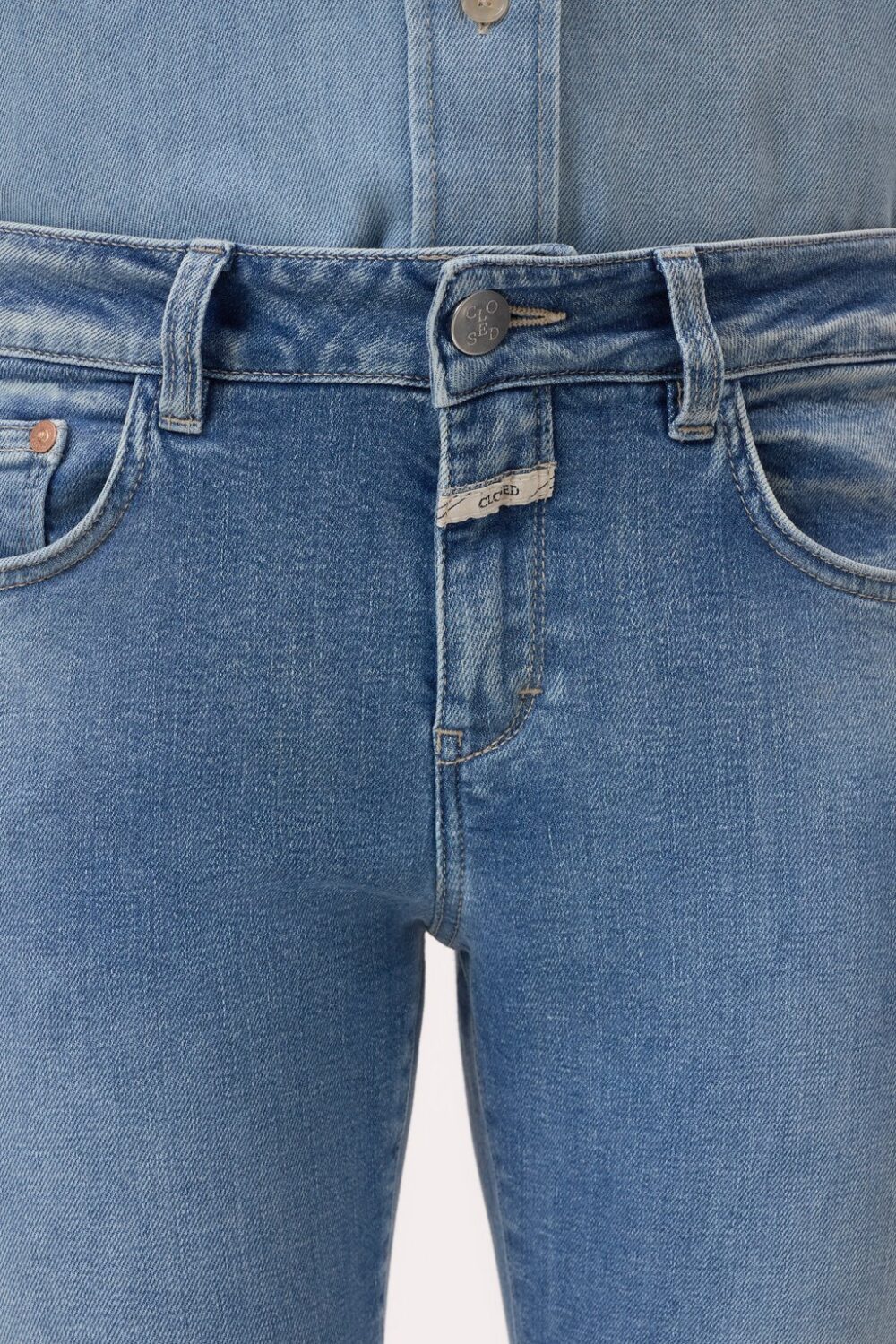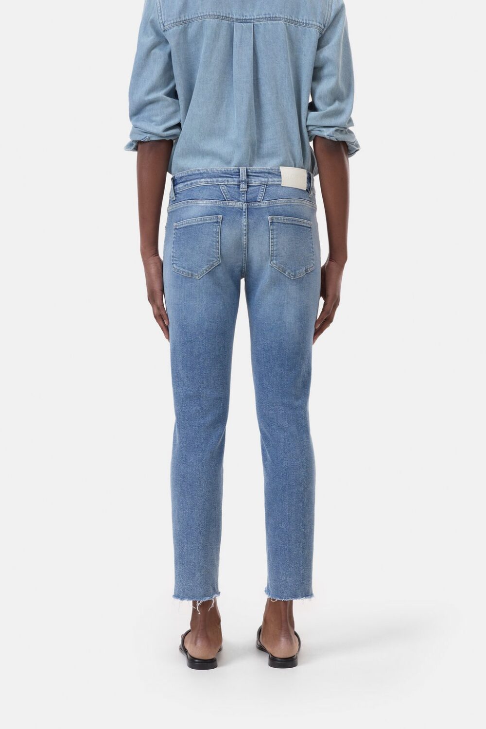 Crafted from mid-weight Super Stretch denim (11.5 oz.) in a blue tone with a light gradient: 5-pocket jeans in a skinny fit with a low-rise waist and cropped, slim leg. This style features a raw hem. Made in Italy.