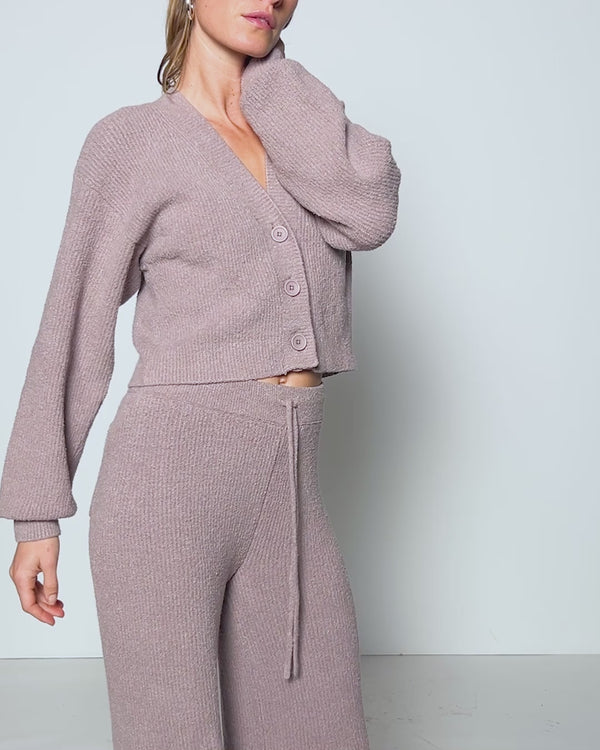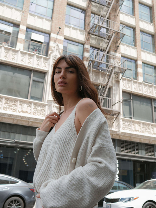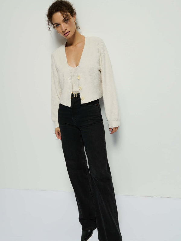 Nation’s V-neck cardigan is the layering piece your closet needs this season. Balloon sleeves with cuffs and a center front button closure.