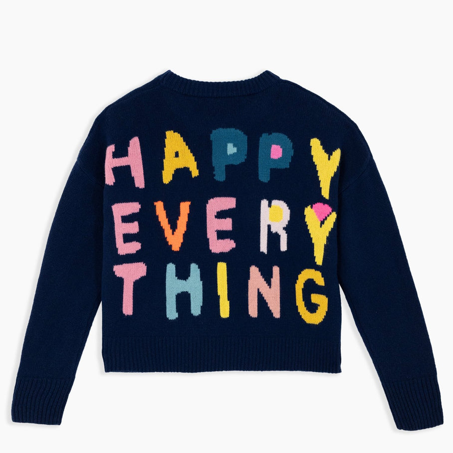 The Happy Everything sweater is back in 100% cotton knit. Everything is happy about this pull-over sweater! The statement is derived from Kerri’s ‘Happy Everything’ original artwork. Wear with your favorite jeans over the holidays or everyday and spread some happy!