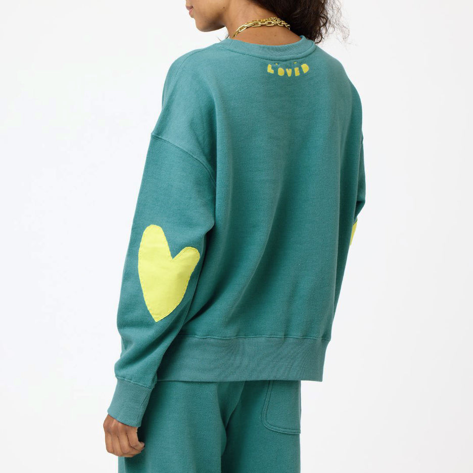The Boyfriend Sweatshirt in 100% cotton fleece is cozy but not bulky. It is designed with Kerri’s Imperfect Heart elbow patch stitched with a contrast border—plus a ‘LOVED’ detail at the back collar. Pair it with her Barb Sweatpant for a chic but cozy look!