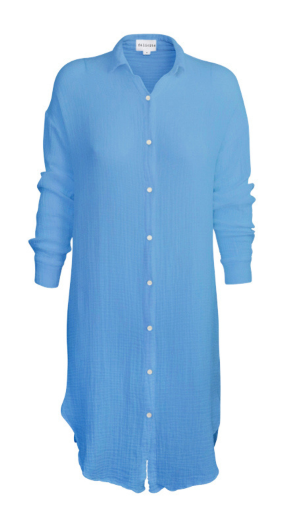 Think of it as the Boyfriend Maxi’s little sister—the same effortless button-down ease, now cut to tunic length. Wear it solo as a shorter dress, or layer it for a more relaxed vibe. Different length, same timeless appeal.
