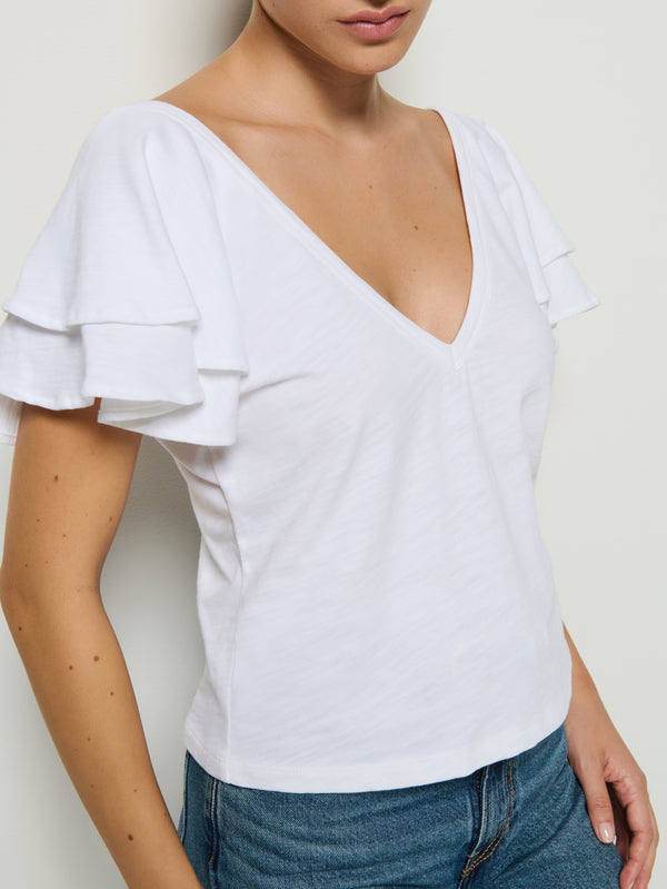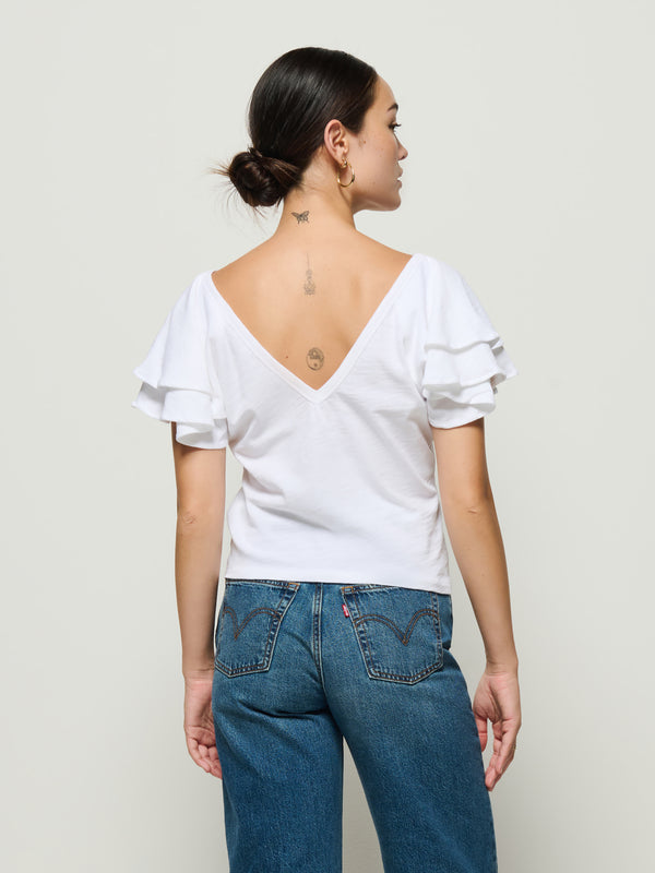 Bring the wow factor effortlessly. Front and back v-neckline, double layer ruffle sleeves, and bra stays. This one comes in Optic White.