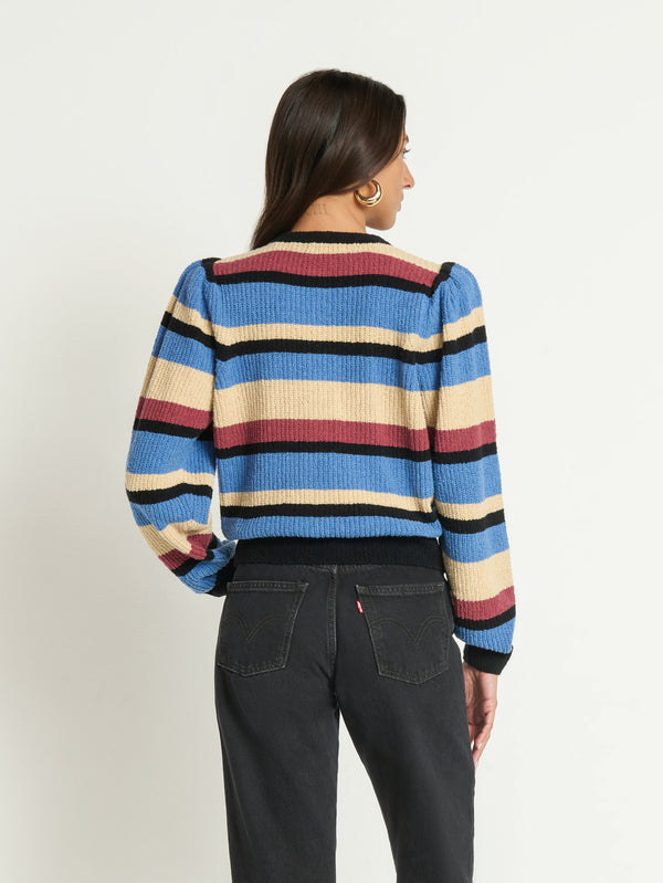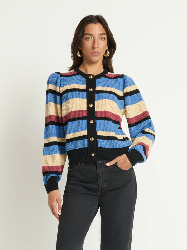 A casual yet chic cardigan that you’ll return to year after year. Knit from plush Pima Velour, the Carmela has a relaxed fit, crew neck, bishop sleeves, and dome gold buttons. This one comes in Velour Multi Stripe.