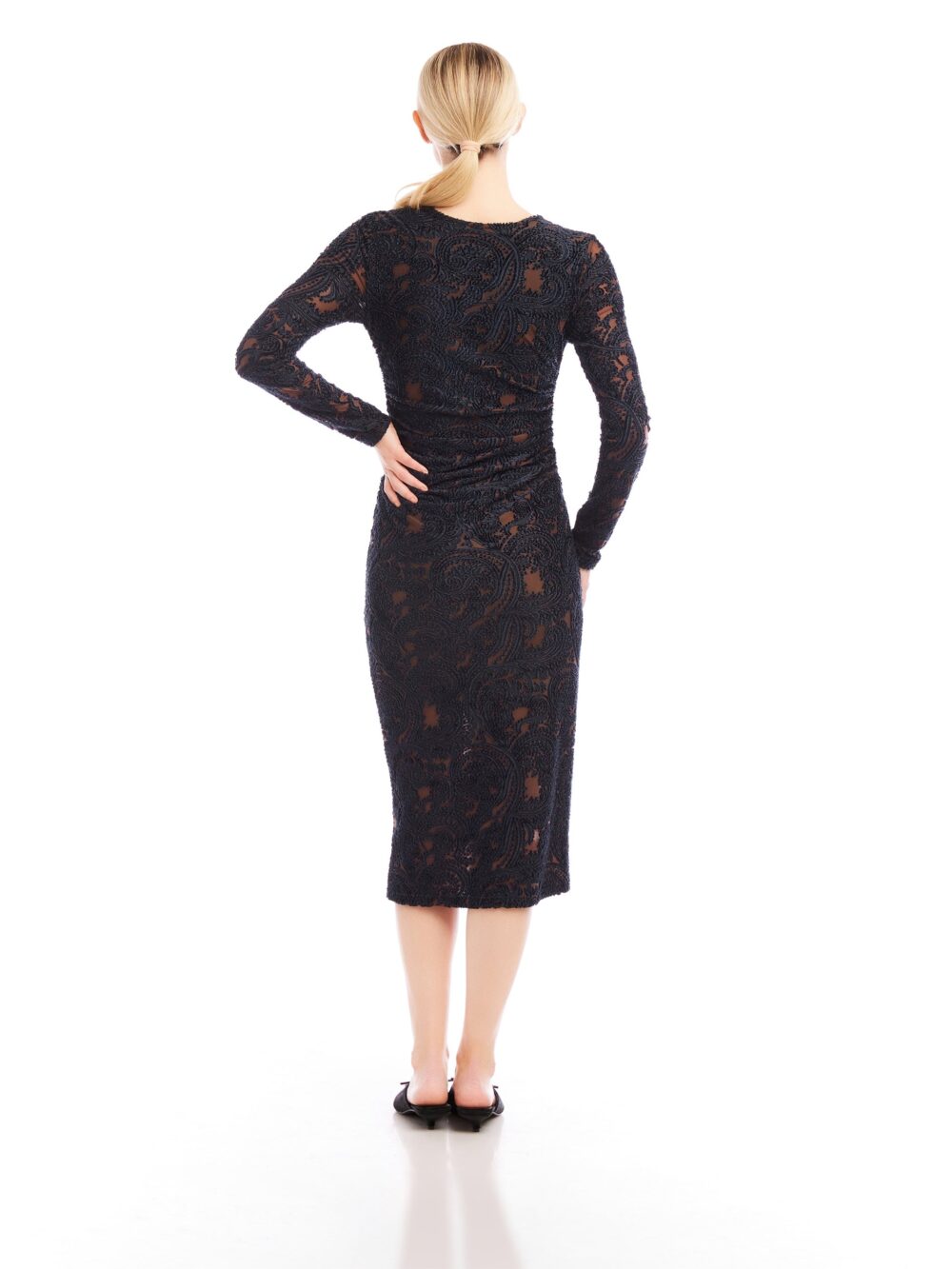 The Carolina Dress is made of luxurious velvet burnout material, featuring a stunning paisley print. The bodycon silhouette hits below the knee, perfect for cooler weather. Dress up for a night out or special occasion in this elegant and stylish dress.