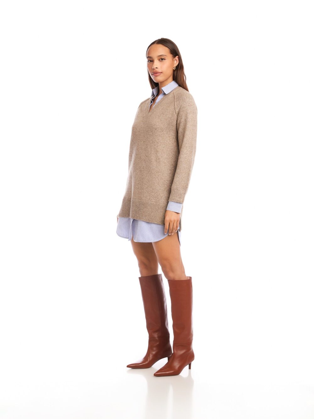 The Carrie Mixed Media Dress features a classic collared shirt-dress base with striped shirting details and an attached soft sweater overlay. Designed with a V-neckline, raglan sleeves, ribbed trims, and a crisp collar, the shirting layer also includes buttoned cuffs for a polished finish. A subtle shirttail hem peeks out from beneath the sweater for a perfectly styled layered effect without the bulk.