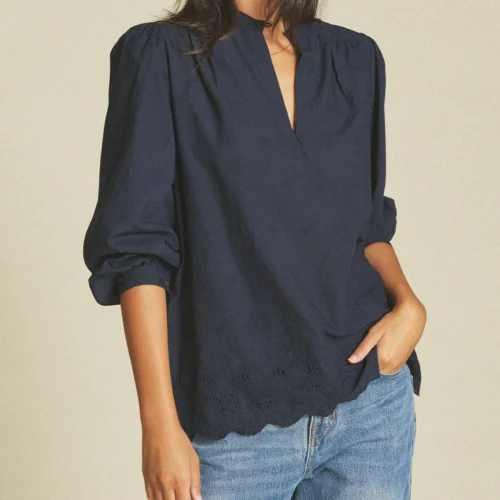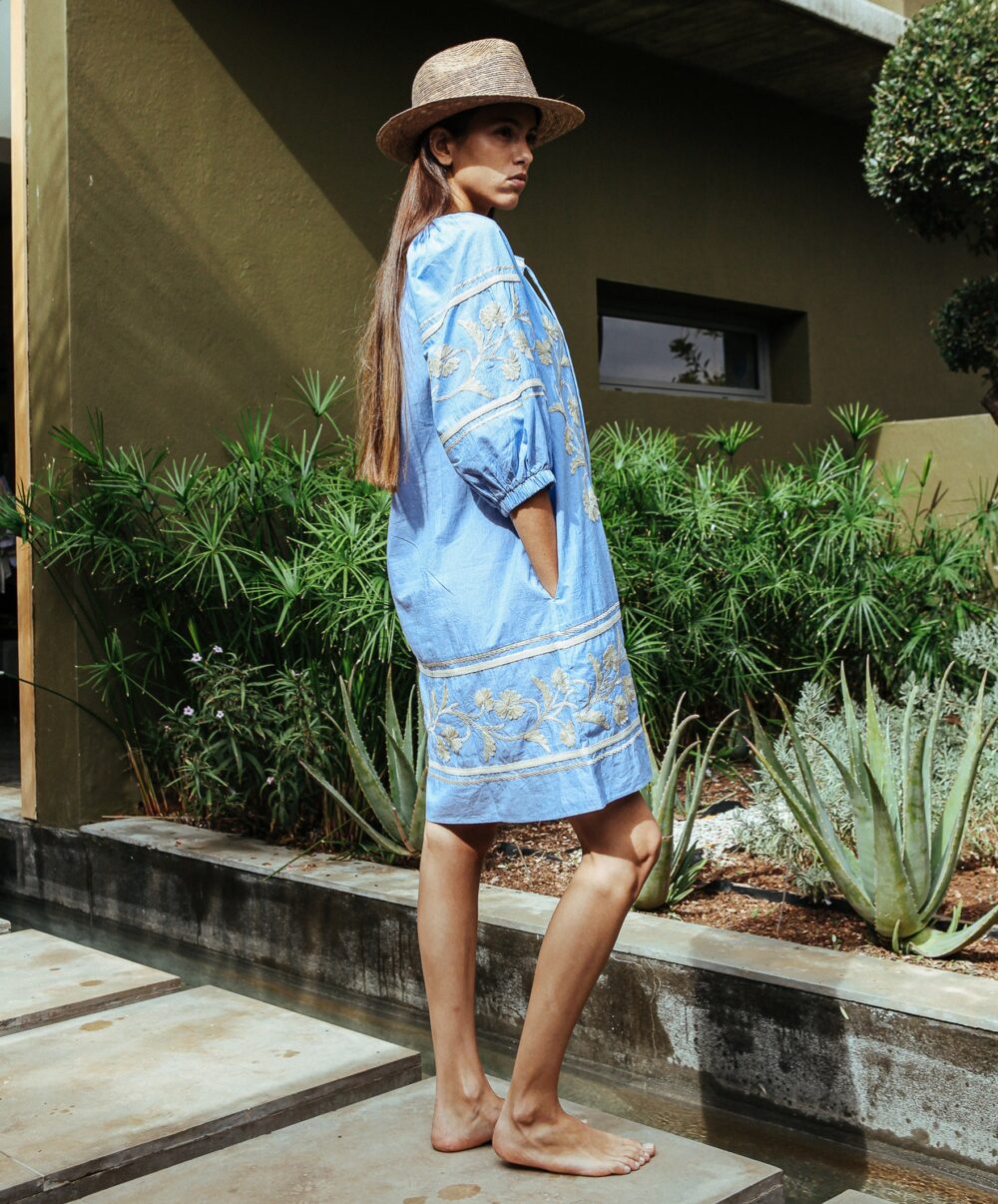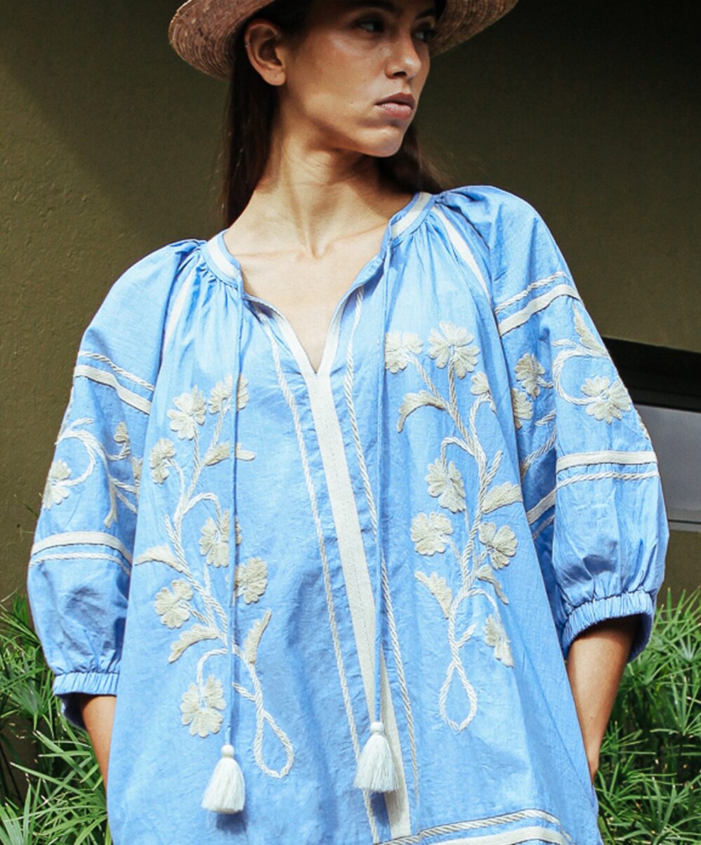 The intricate crewel work and rope embroidered Chiswick dress by Rose & Rose, features natural tape work decoration and tasselled ties. This easy to wear flattering dress, cut in soft cotton shirting, has concealed pockets and balloon sleeves with elasticated cuffs.