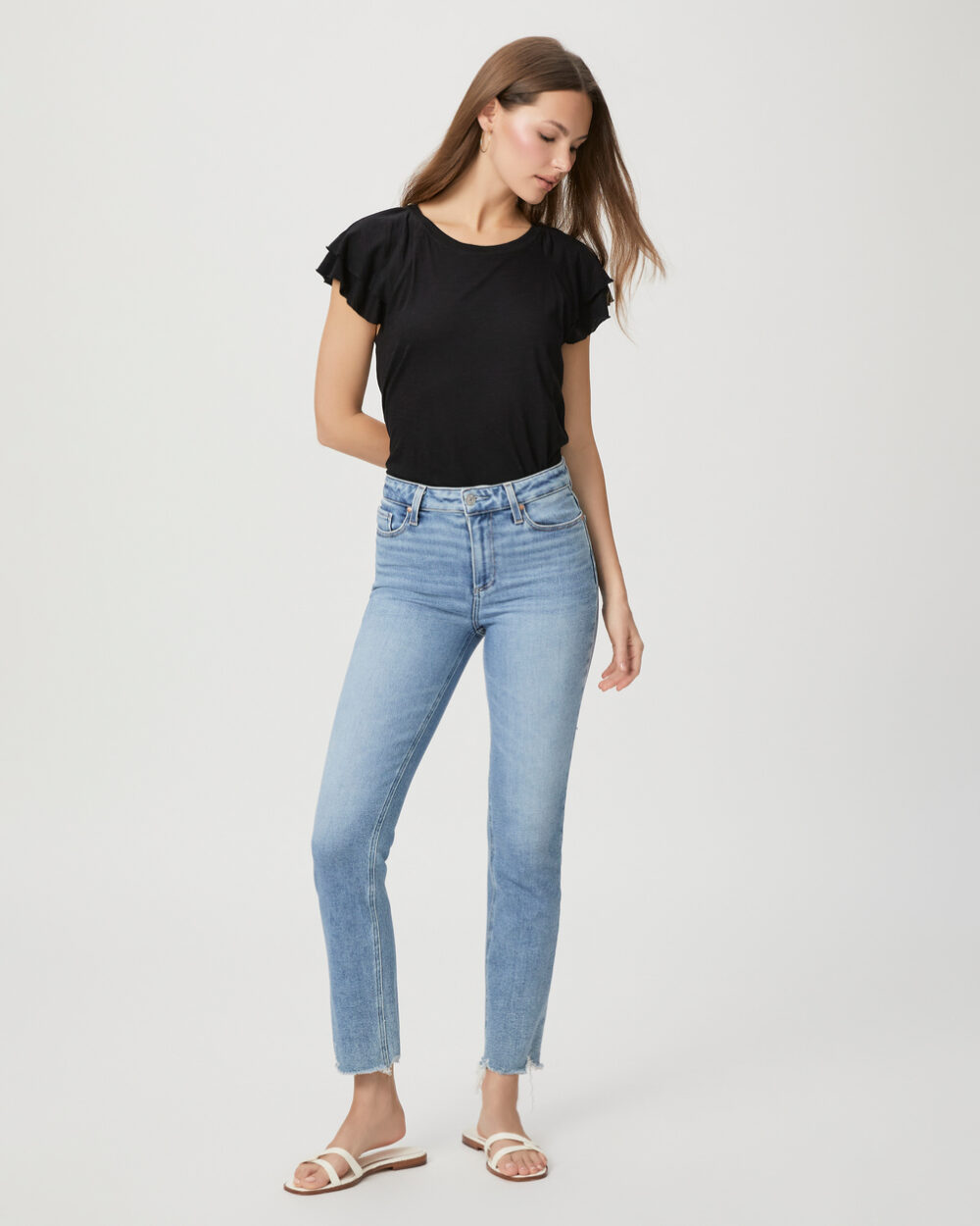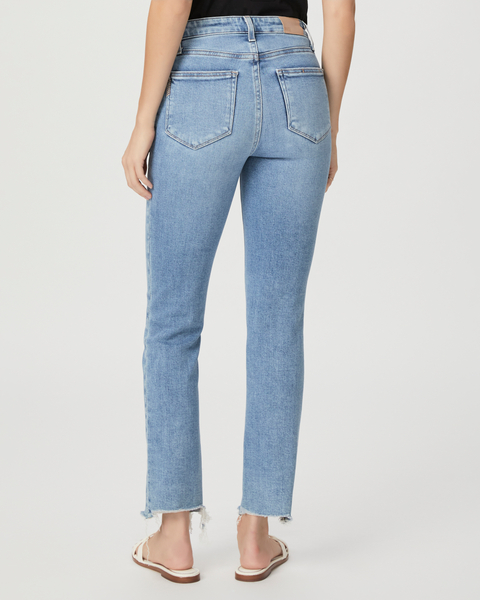 This high-rise, perfectly straight jean is lean through the leg and finishes at the ankle with a raw, destroyed hem. This pair is cut from PAIGE Vintage denim in a perfectly lived-in medium wash with whiskers and mixed metal hardware. PAIGE Vintage takes all of the work out of breaking in your favorite pair of vintage jeans.