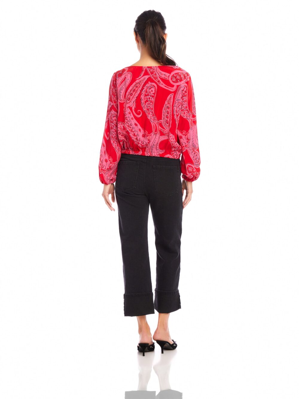 The Claudine Top features a stylish tie waist and eye-catching scarlet paisley design. Pair it with your favorite high waist jeans for a chic and versatile look.