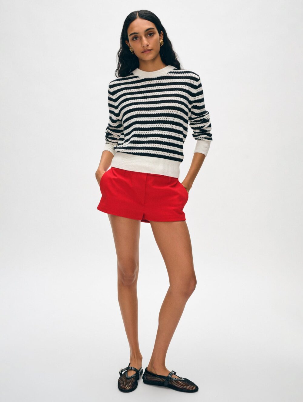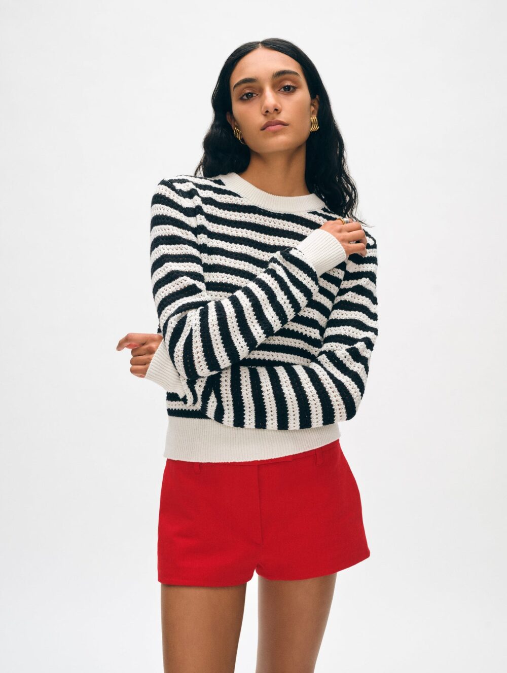 This crewneck boasts a mesh cotton blend construction that balances breathability with coverage. The knit hits at mid-hip and boasts a relaxed fit that makes for an easy throw-on-and-go for warm mornings and cool evenings alike. We love to style this top with a pair of jeans for an added dose of eye-catching texture.
