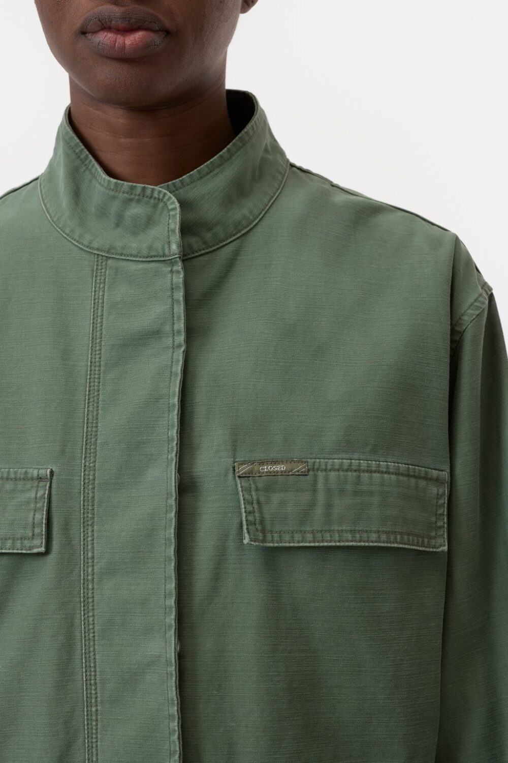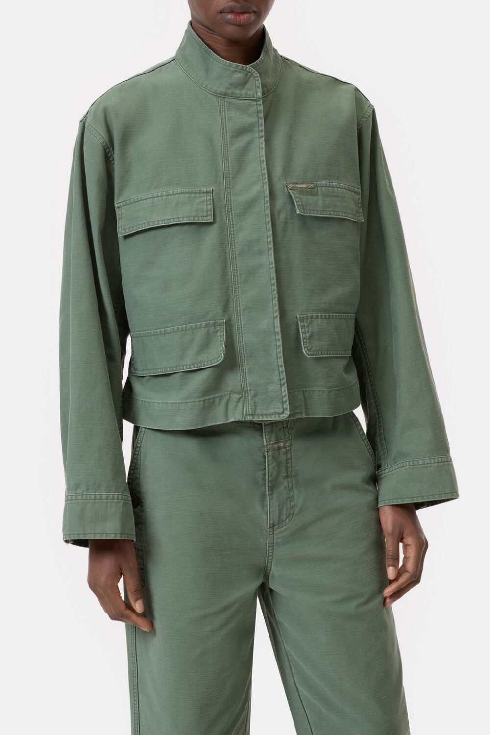 Made from pure cotton with a subtle weave texture: short utility jacket in a regular fit with a stand-up collar, flap pockets, and press studs. The slightly textured surface creates a subtle faded-wash effect and a softer feel. The width can be adjusted with side press studs at the waist.