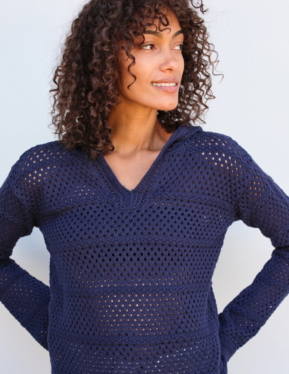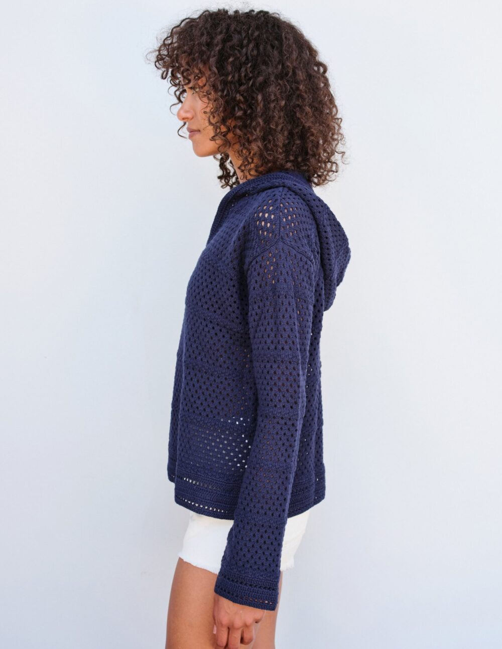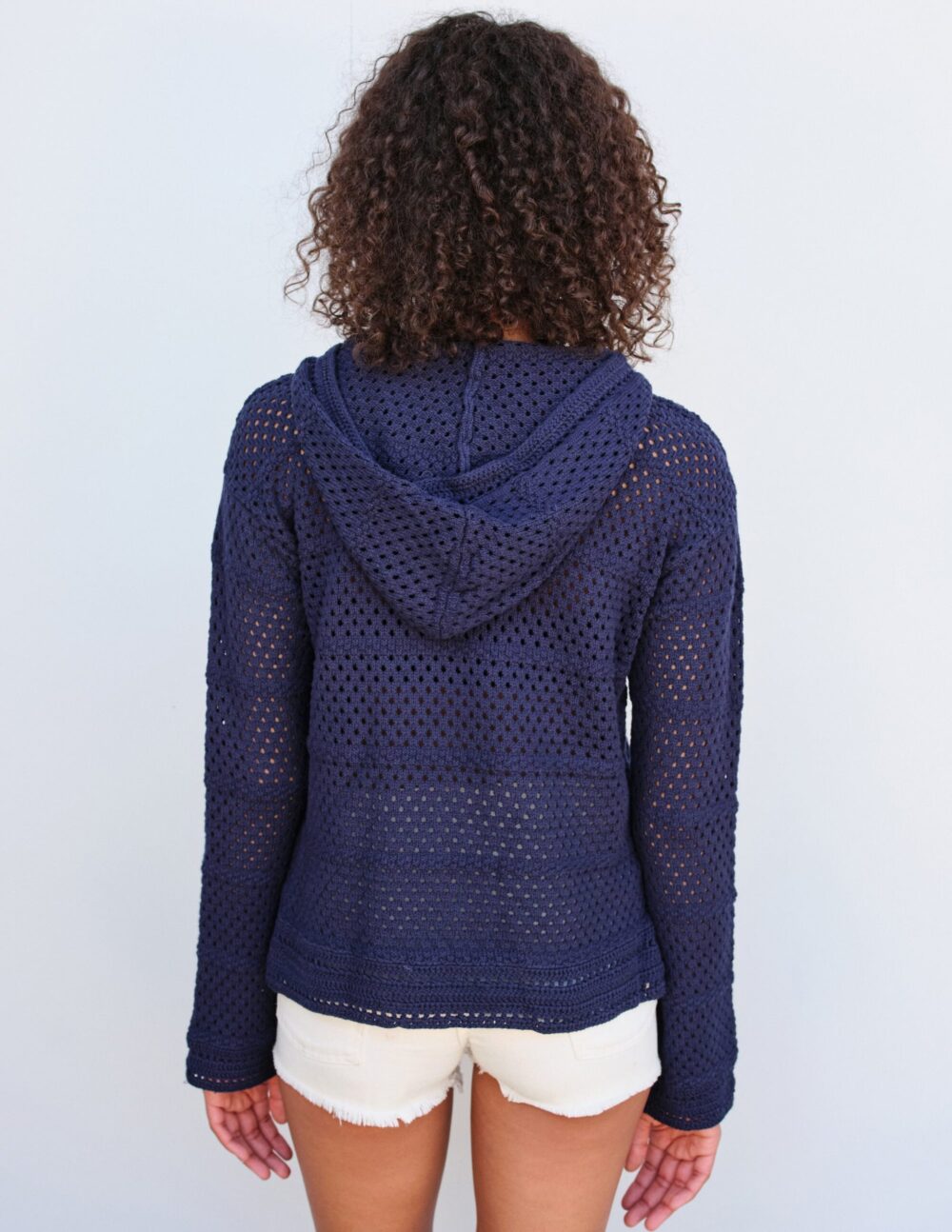 Long sleeve crochet hoodie with v neck trim is the perfect finishing piece to a cool look.