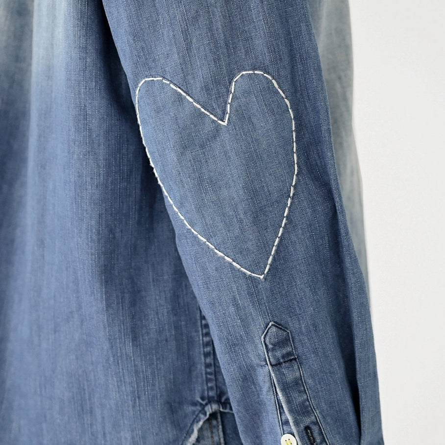 Like its been in your wardrobe forever, meet your favorite Mia Shirt in KR’s new light weight denim. Perfectly worn out and faded in all the right places, with a tiny embroidered heart detail. The well worn hemline of the shirt is aged to perfection making this shirt look like it’s been loved for a really long time. Perfect to wear as a shirt or shacket!