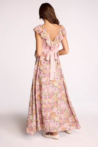The Dusk Ella Dress exudes femininity. Made from lux cotton silk in a beautiful monochromatic floral print, the Ella dress features a delicate v-neckline trimmed with flirty ruffles and a belted fit to create a cinched empire silhouette. A true maxi length, this dress will finish just past your ankle bone.