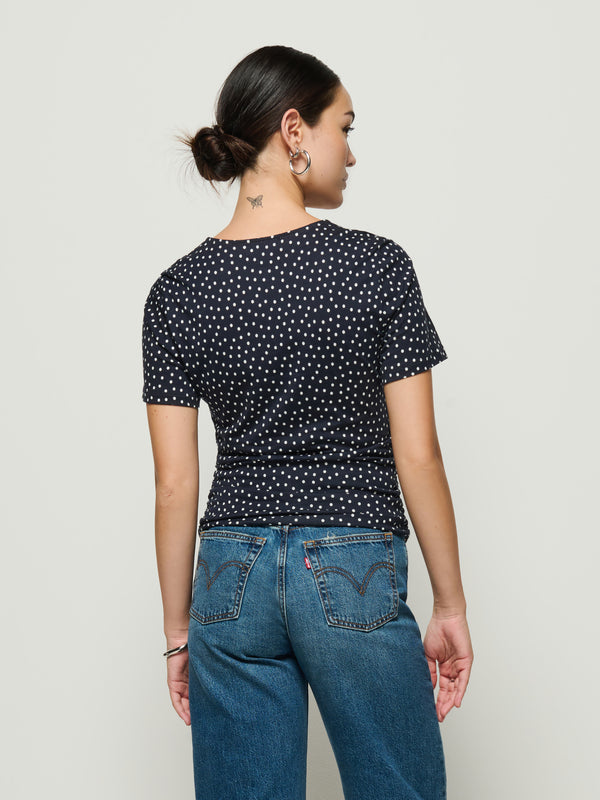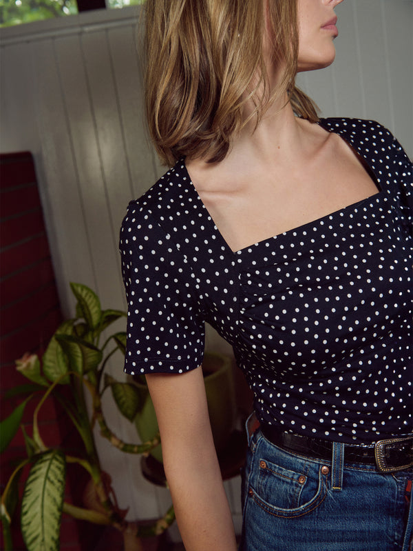 Featuring a square neckline, side shirring, and slim short sleeves, this tee is the definition of minimum effort with maximum impact. Dress it up, dress it down, make it you. This one comes in Cabana Polka Dot.