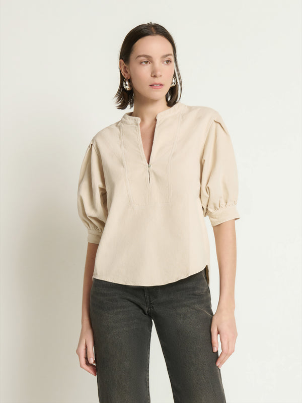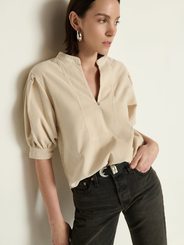 Not your average neutral. This collared corduroy top buttons at the chest and includes structured, elbow-length puff sleeves—a year-round staple, if you ask us.