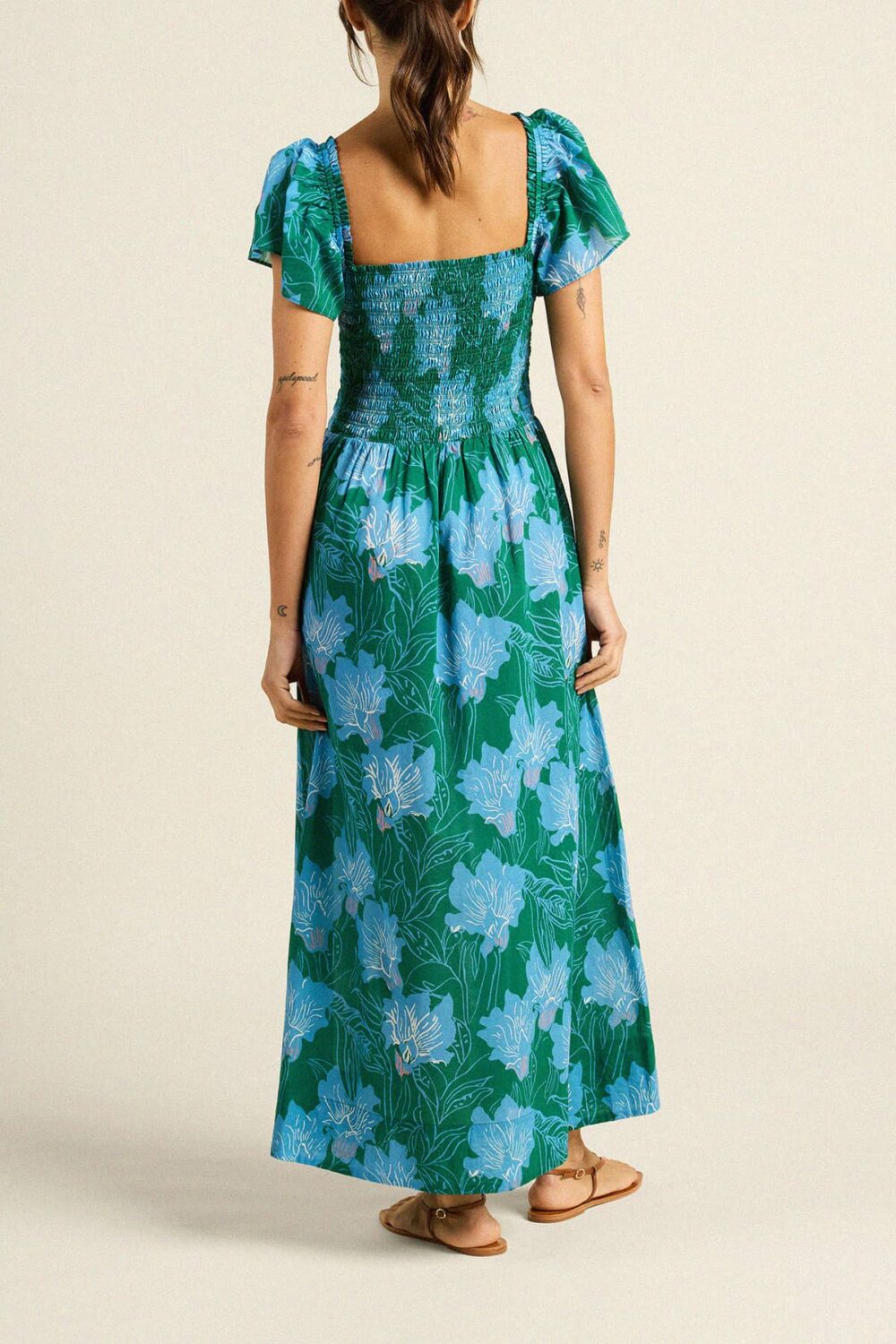 The Esme Dress is an elongating maxi dress with a smocked bodice that provides a comfortable fit. The neckline is finished with delicate ruffle trim and subtle fluttering sleeves that provide flattering shoulder coverage. Finished with signature hidden side seam pockets.