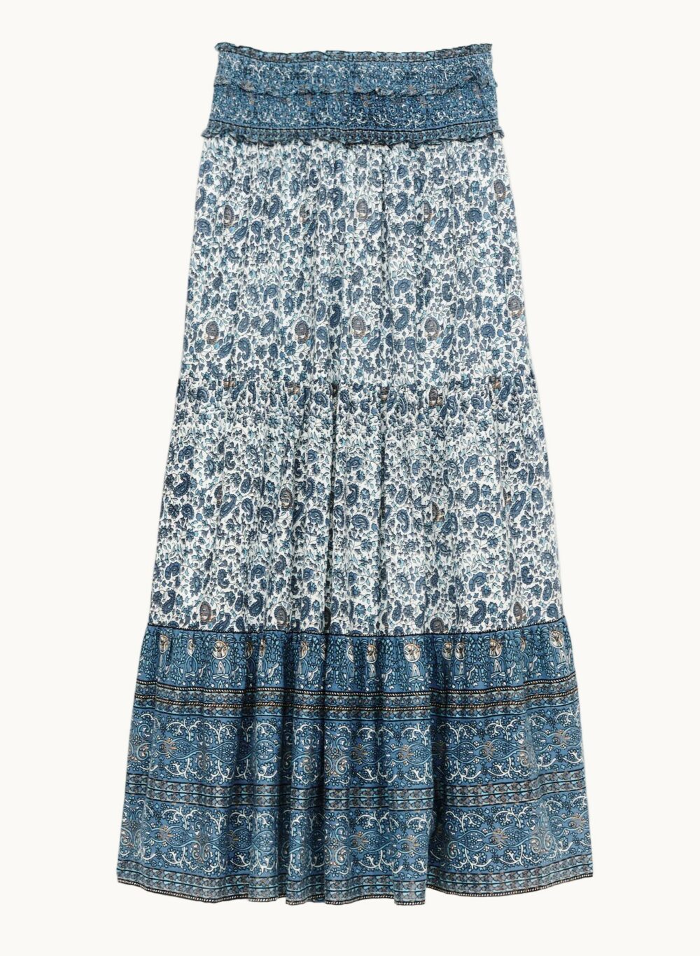 Made from cotton the Esti maxi skirt is designed in a pretty tonal blockprint. It is detailed with an elasticated and frill waistband in a breezy free flowing fit.