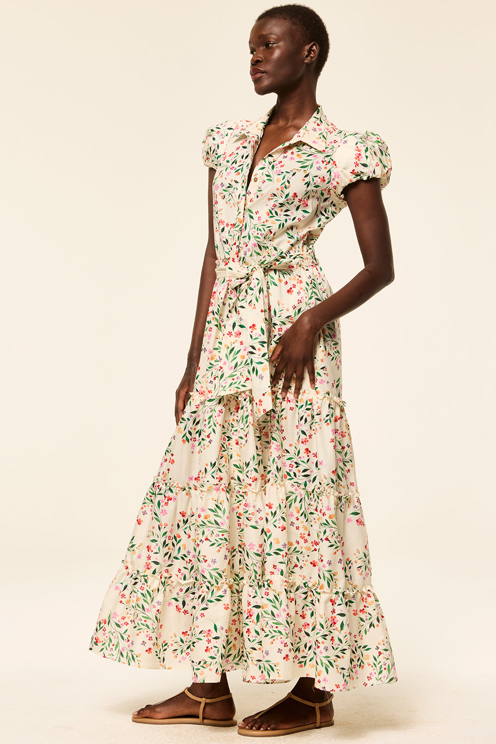 Effortless and feminine, this classic Eveleigh dress is handcrafted from a soft cotton in a timeless Spring Ditsy print. The button-front closure runs from the neck down the length of this maxi silhouette, while a self-tie waist cinches for a flattering fit. Short puff sleeves and a fold-over collar complete this comfortable yet chic style.