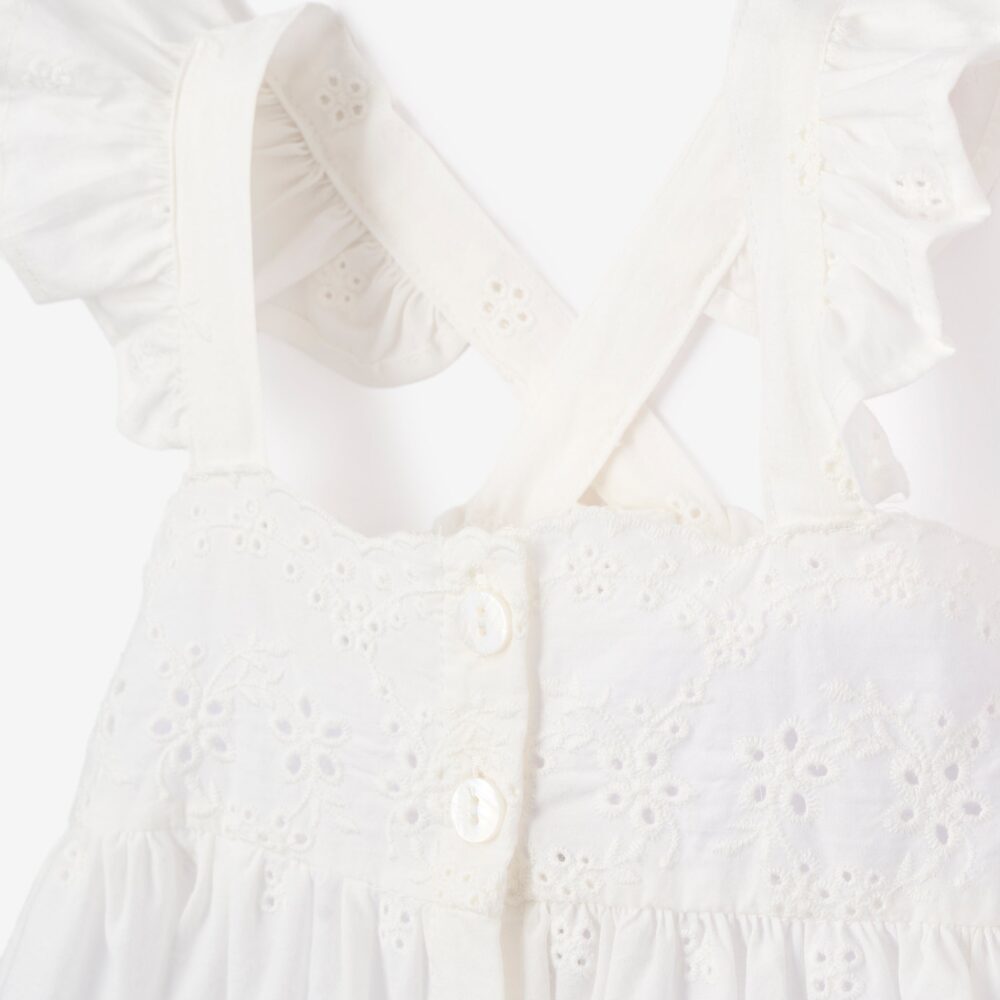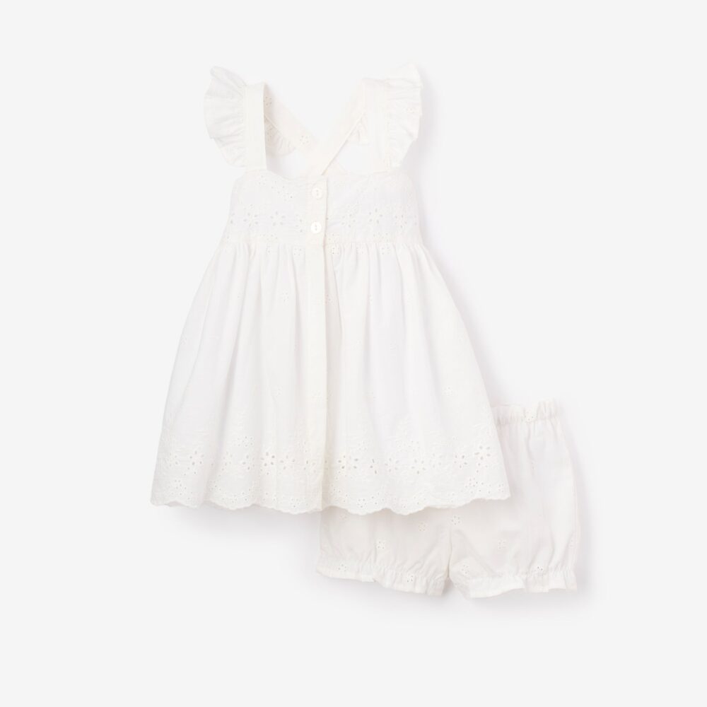 A vintage-inspired treasure, this eyelet lace dress features a scalloped hem, delicate cross-back straps, and a classic button front. Crafted from 100% breathable cotton with a matching bloomer, it’s a timeless choice for warm days.