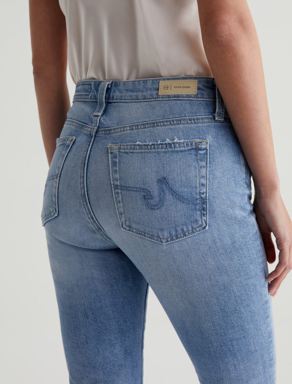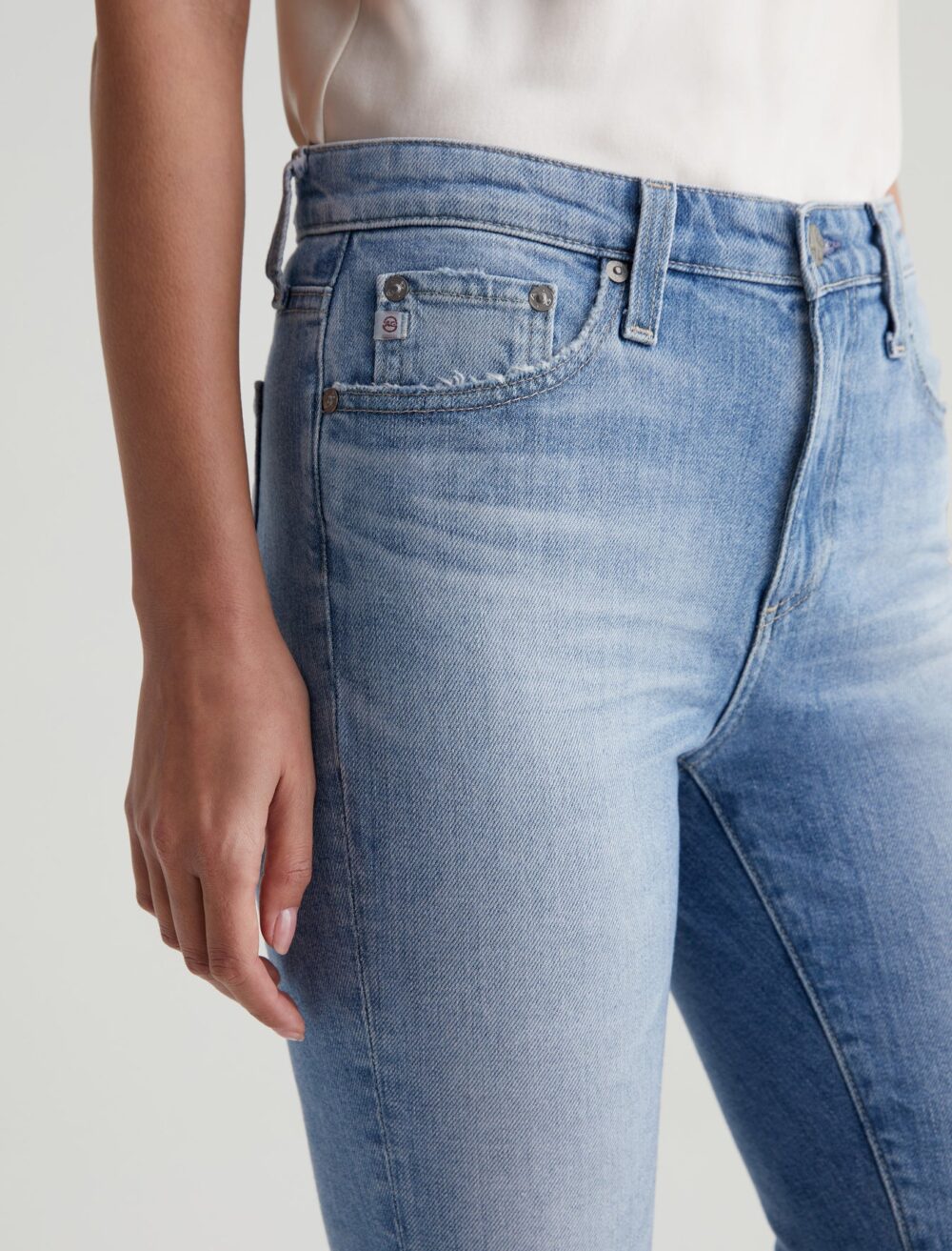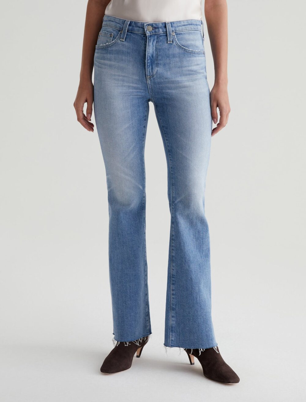 The Farrah Boot is AG’s high-rise bootcut jean with a light blue wash and raw hems. Crafted from stretch-blend 11 oz. Journey Denim, it’s got faded details, crease marks, and worn pocket edges for a 22-year AG-ed™ Denim finish. These five-pocket bootcut jeans for women sit high on the waist and have a skinny fit through the legs before opening into a subtly flared shape.