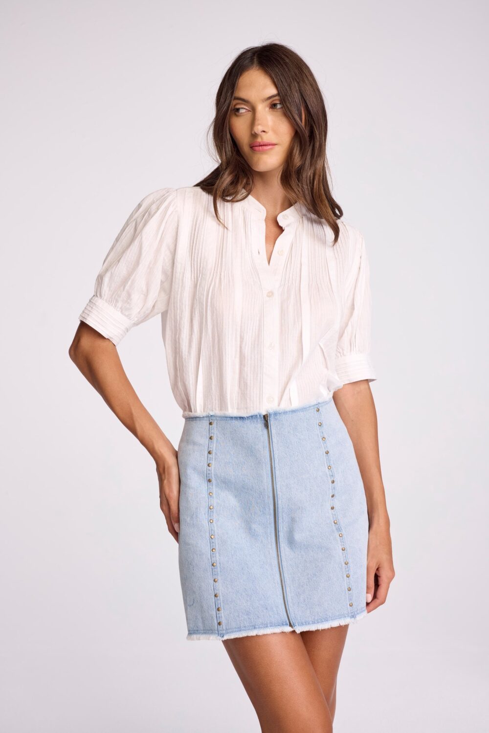 Introducing the Fey: An elevated Short Sleeve Pin tuck Shirt. Available in classic white or shadow stripe, it features a slightly puffed sleeve gathered by a delicate arm band, blending sophistication with everyday wearability. This timeless piece effortlessly transitions from casual to refined, making it a versatile wardrobe essential.