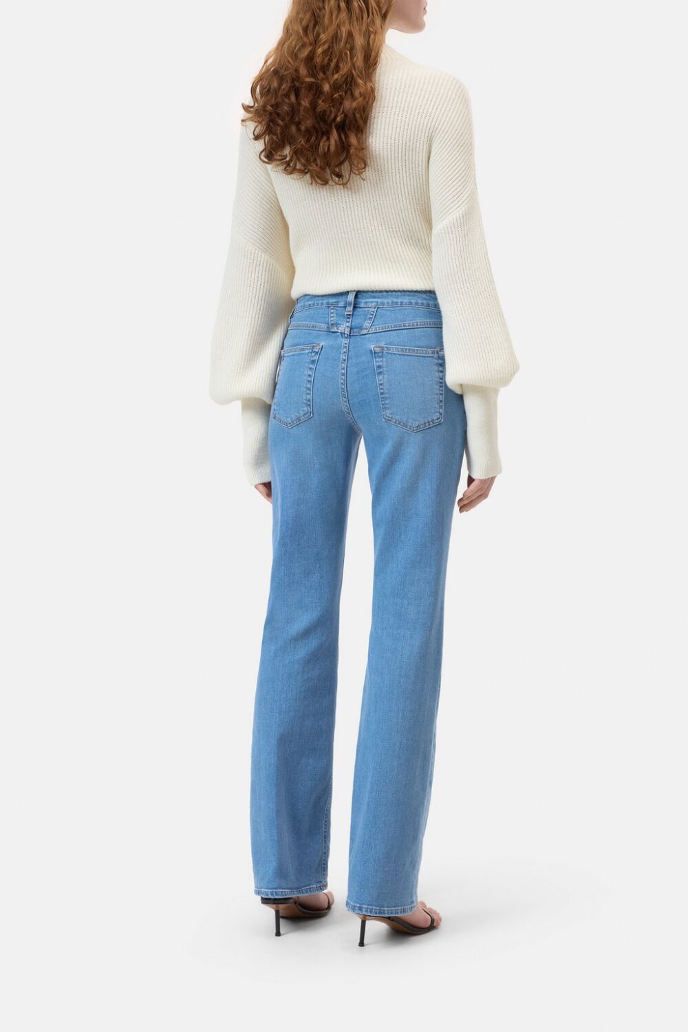 The Jovanna denim features a flared cut with regular leg proportions. Made in Italy with Candiani’s premium fabric (11.5 oz.) these jeans offer excellent stretch. Classic Five pocket design with button closure and zip fly. Made with regenerative cotton and eco-friendly Roica stretch fiber.