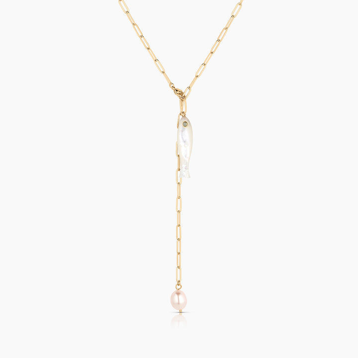 A best seller for a reason. This gemstone fish charm clipped on an everyday pearl lariat makes for a fun and chic everyday look. This lucky hand-carved mother of pearl fish (with an amazonite eye!) is removable and can be worn on other necklace chains, or layered with your other favorite charms.