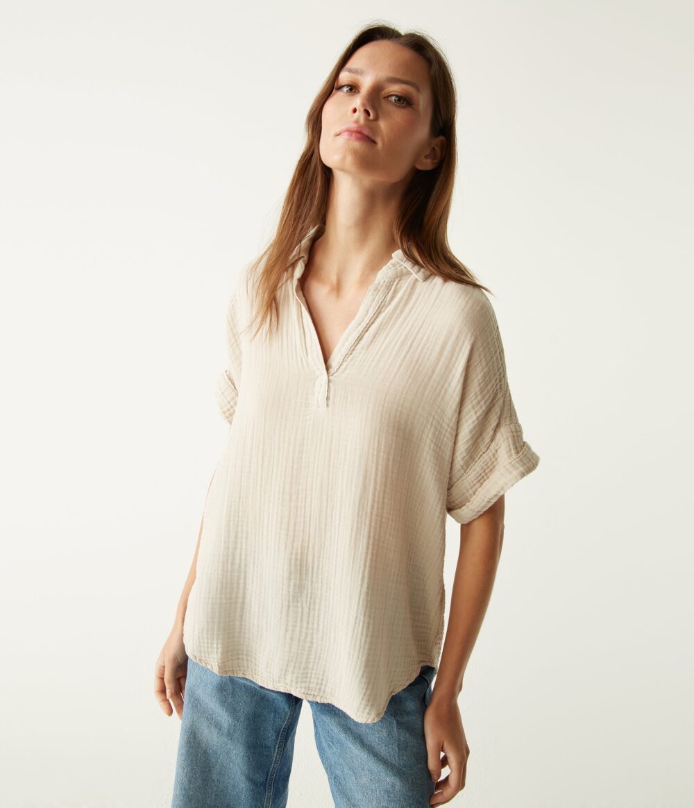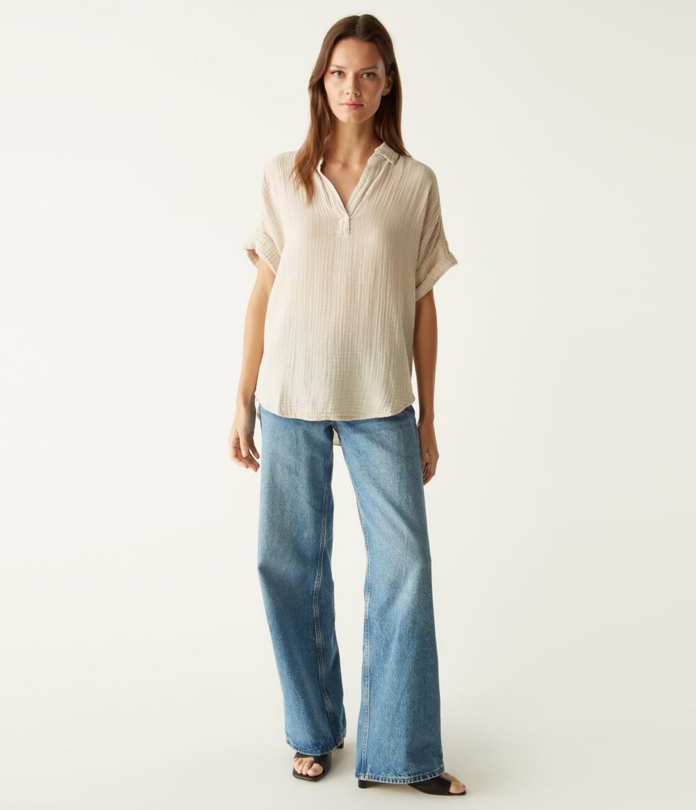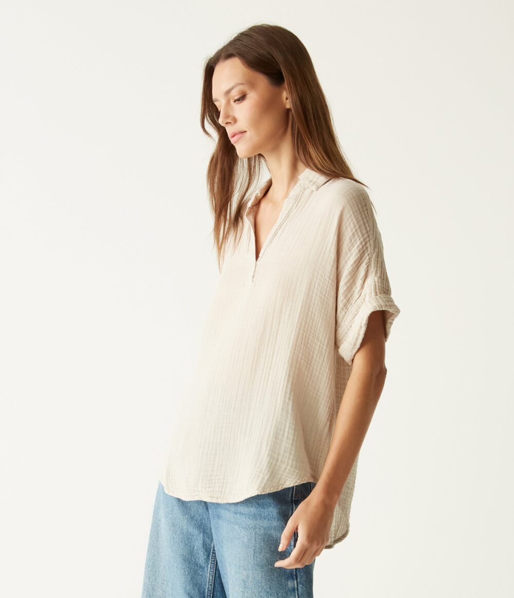 Pop Gigi on with everything. Featuring an easy fit, short rolled sleeves with a collared neck, and a raw edge shirttail hem. Made from 100% cotton Double Gauze that is textured, lightweight, and breathable.