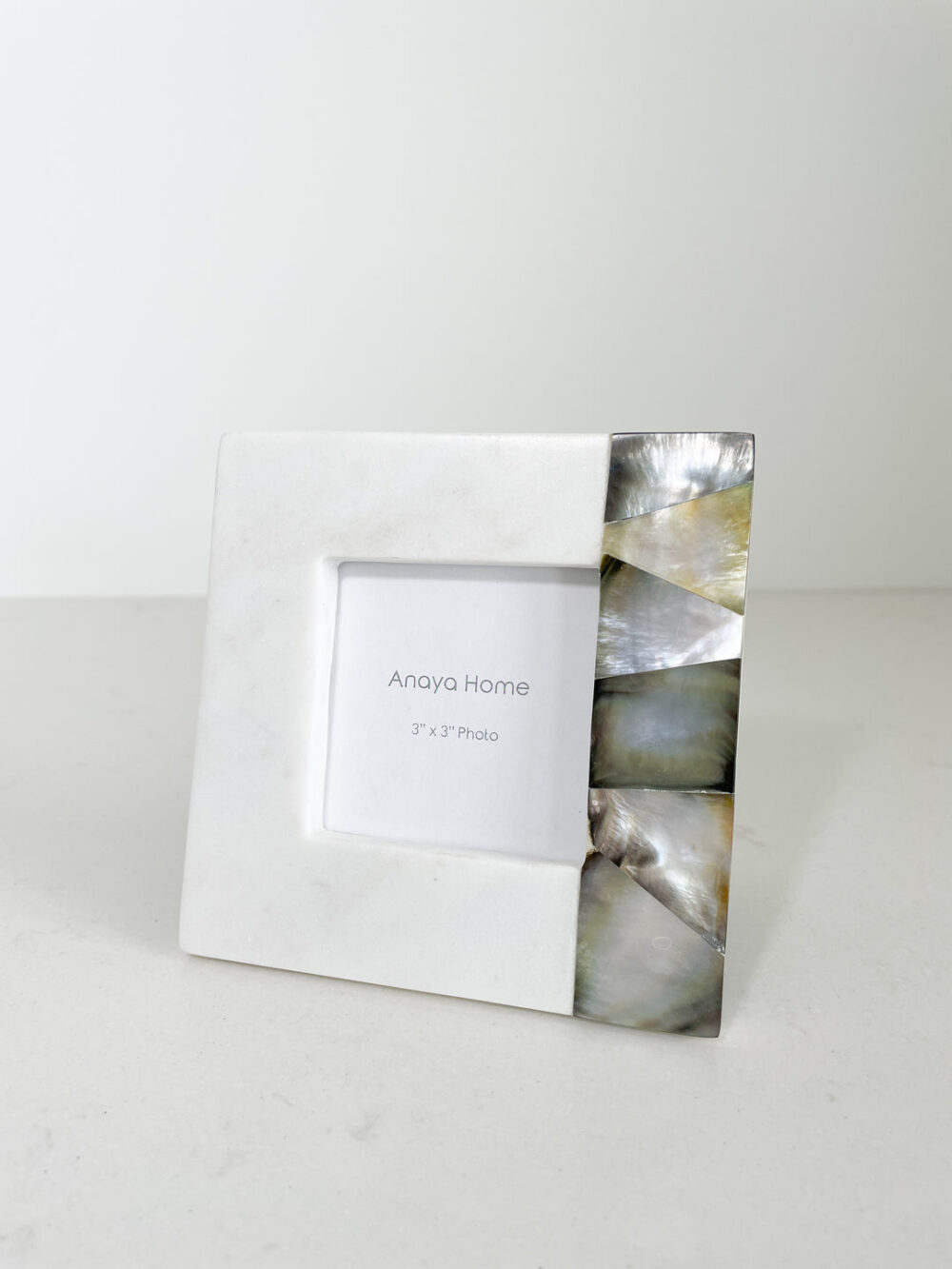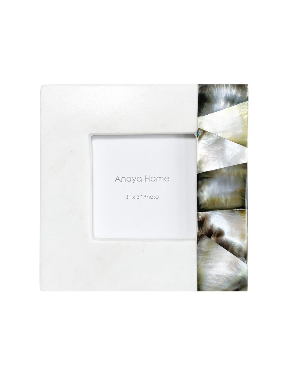 The Grey Mother of Pearl Marble Picture Frames hold a 3×3 and 4×6 photo. The Mother of Pearl detailing boasts a natural iridescent grey hue with delicate touches of golden accents.