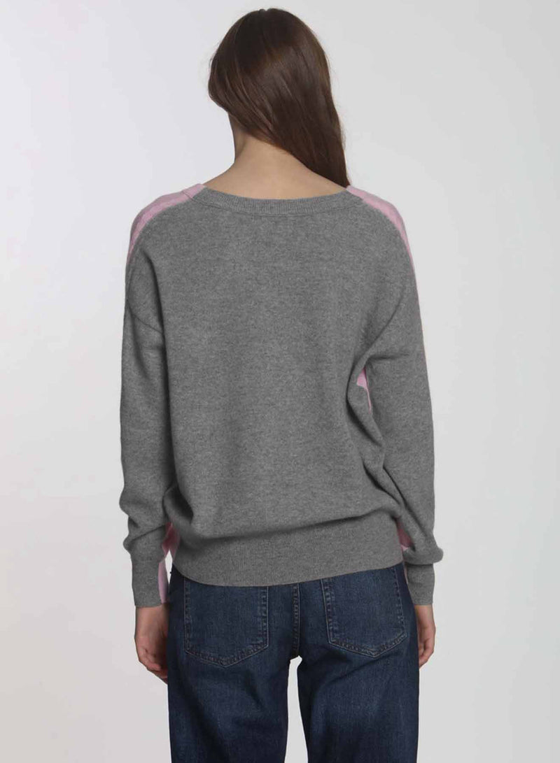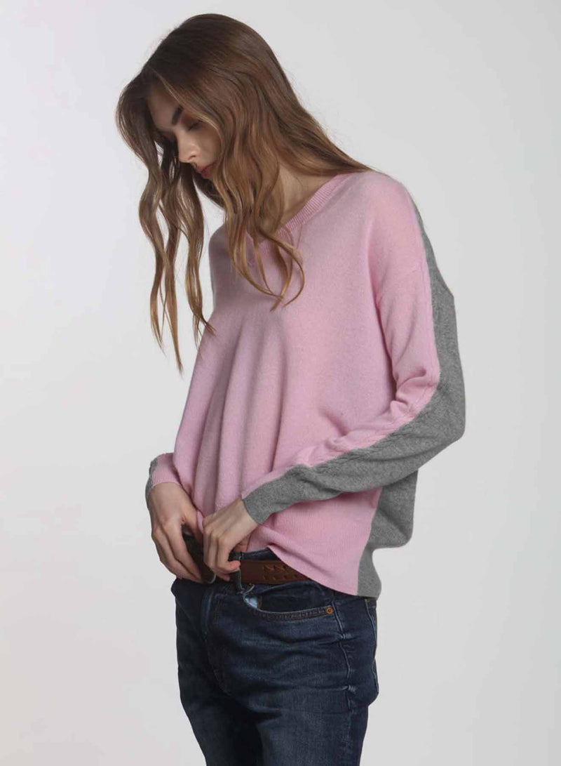 The Half Tone Vee is a 100 % cashmere luxury vee that offers a contrast color transfer at the center of the sleeve, giving the sweater a different color in the front and back. The color block has a delicate baby cable that runs along the color transfer from cuff to neck. We love the pure and simple twist on a basic that gives you endless ways to wear and pair. Depending on the color, this vee works for a dinner out as well as a cheerful day event.