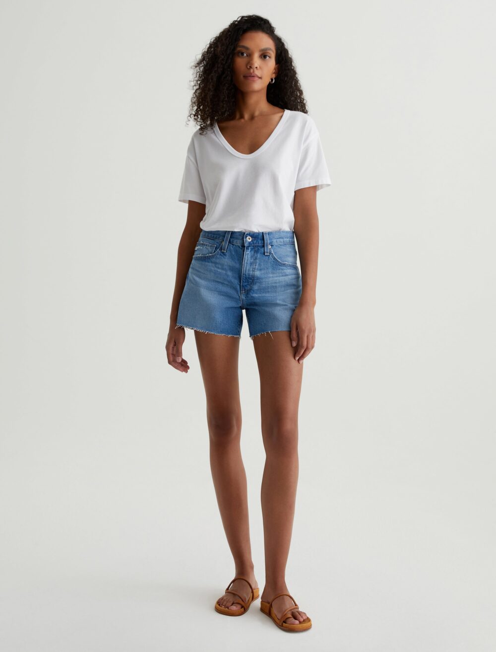 The Halle high-rise cutoff shorts have a relaxed, easy fit through the hips. Cut from 12 oz. Drapey Rigid Denim, these five-pocket women’s shorts come in a brilliant blue wash with soft fading and raw hems.