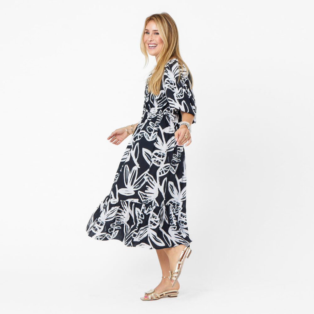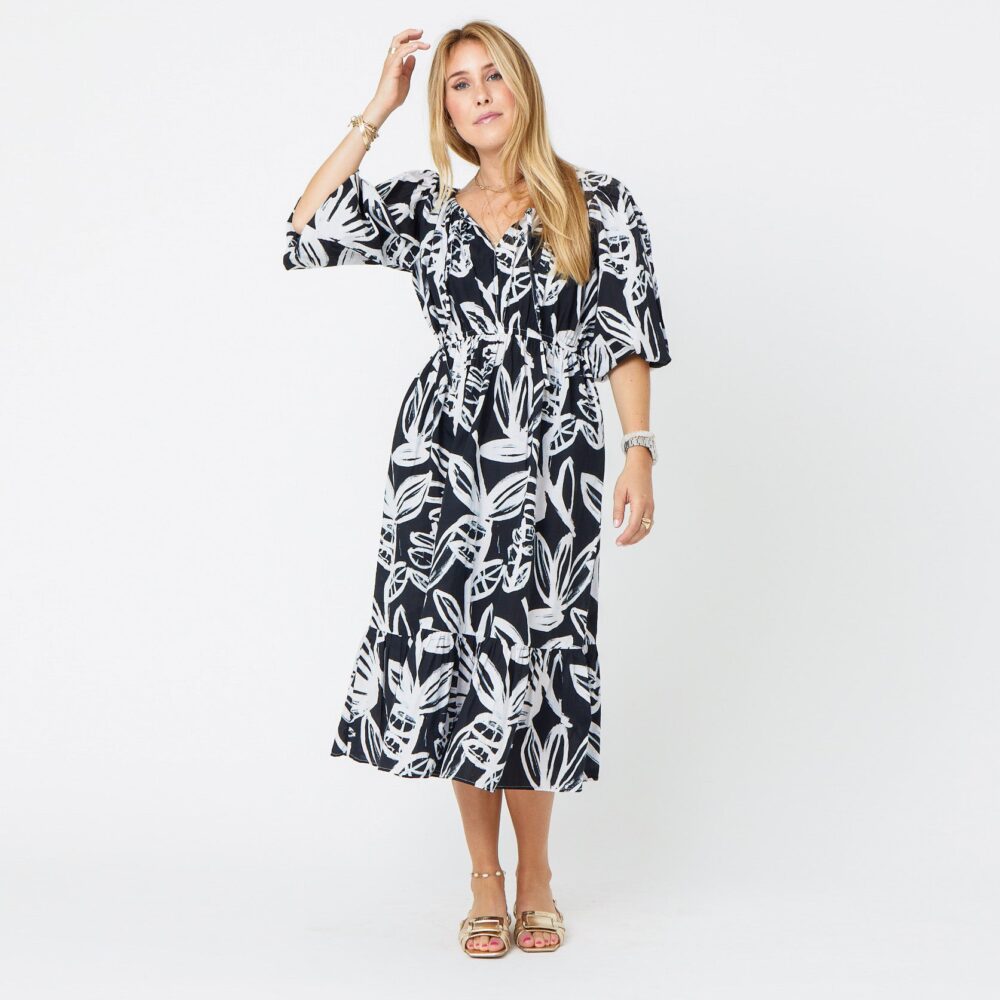 A fresh pattern meets classic color combos with our Harbor Sing Sing Dress, which features Kerri’s botanical artwork, ‘Sing Sing Tree’. Offered in Black and white, this piece easily dresses up and down. Made from 100% cotton voile, it will have you ‘singing’ into Summer.