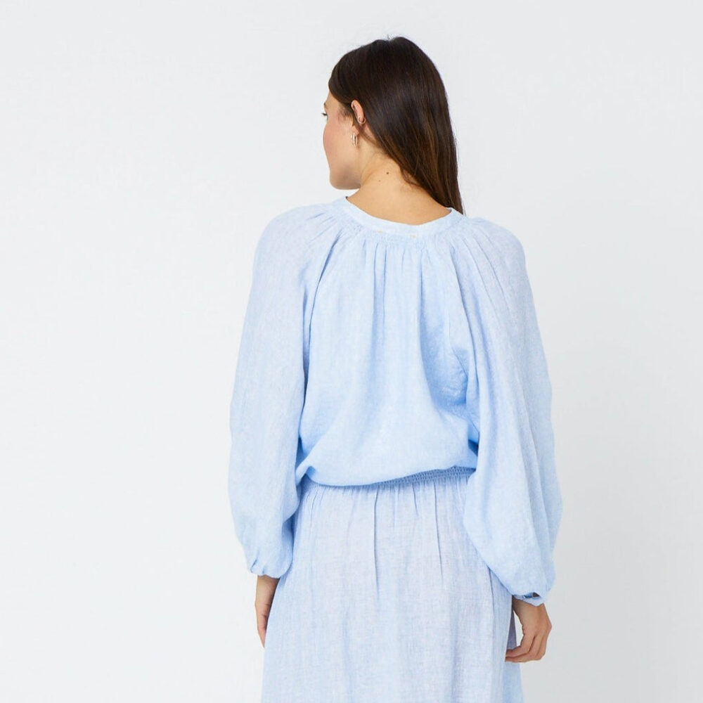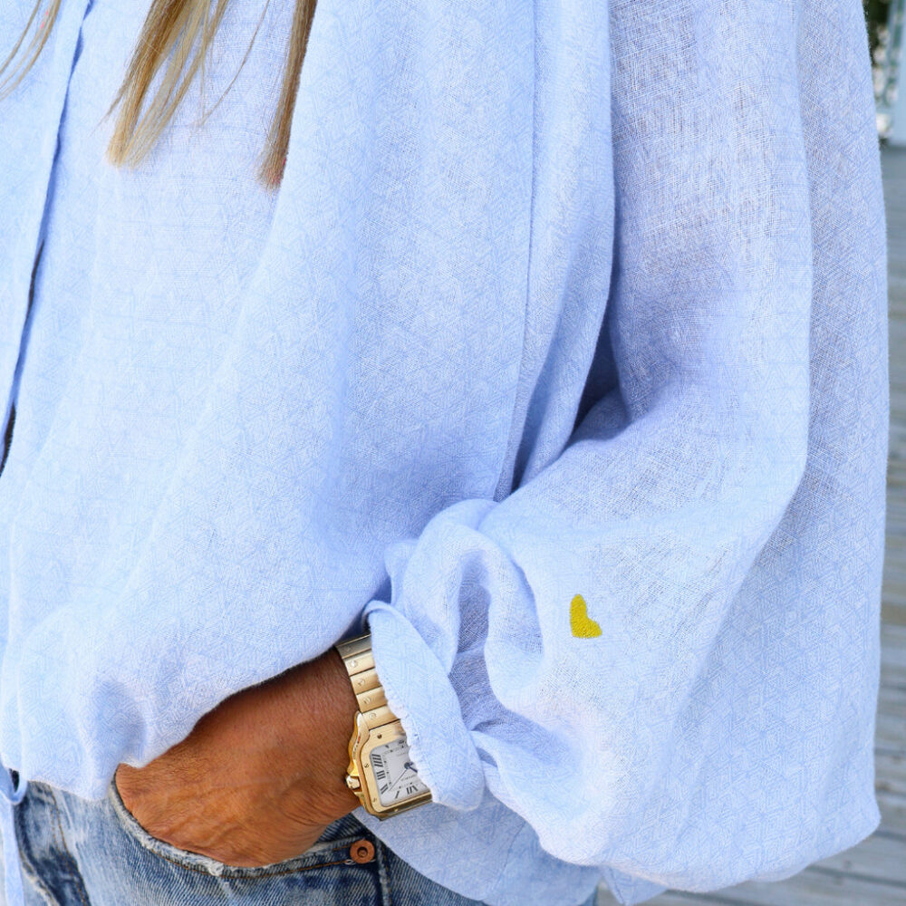 Hello Honey! This blouse is a KR staple for your summer wardrobe. It is effortlessly wearable, made from 100% light blue linen. This print is derived from Kerri’s well-known ‘Jayney’ artwork. Wear this completely open or cinched at the waist for a more flattering fit.