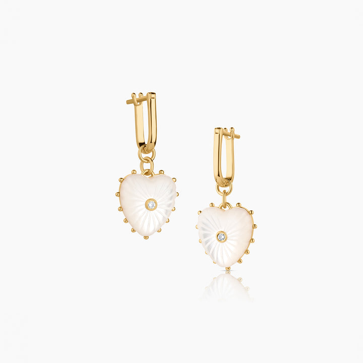 Hand-carved mother of pearl hearts with a sparkling center stones dangling on sleek hoops. Charms are removable for when you are wanting a modern everyday hoop.