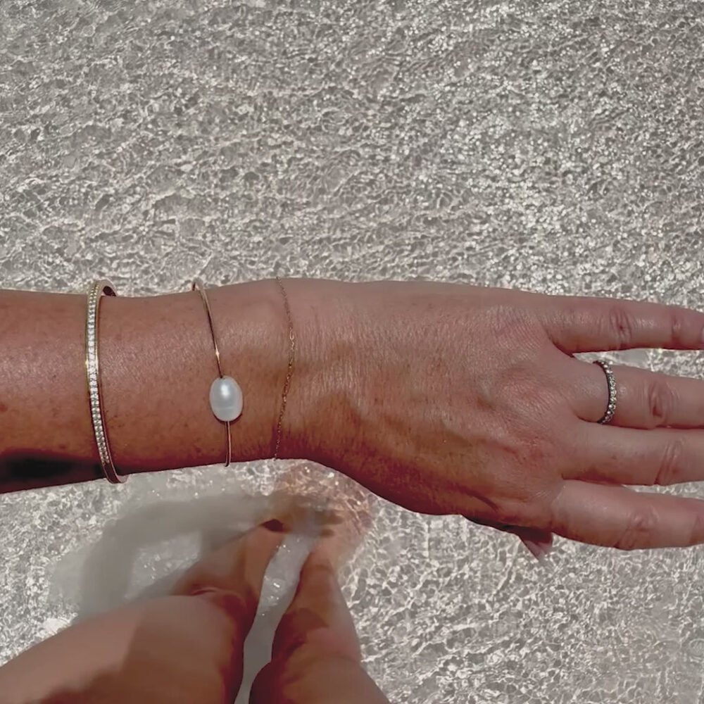 A single, loose freshwater pearl strung along a skinny gold wire. Perfect mixed in with all your favorite bangles, cuffs and chains.