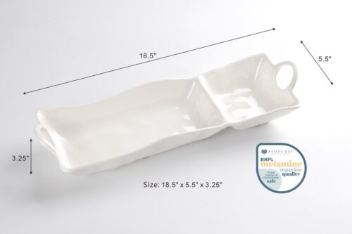 Chip and Dip from the Ivy Collection. Perfect for any dip combo? hummus and pita, salsa and tortilla chips, veggies and ranch or our favorite berries and whipped cream! This piece also makes a stunning display for sushi and soy sauce or crab cakes and tartar sauce. Sleek white-toned superior quality melamine. Great for your indoor and outdoor activities.