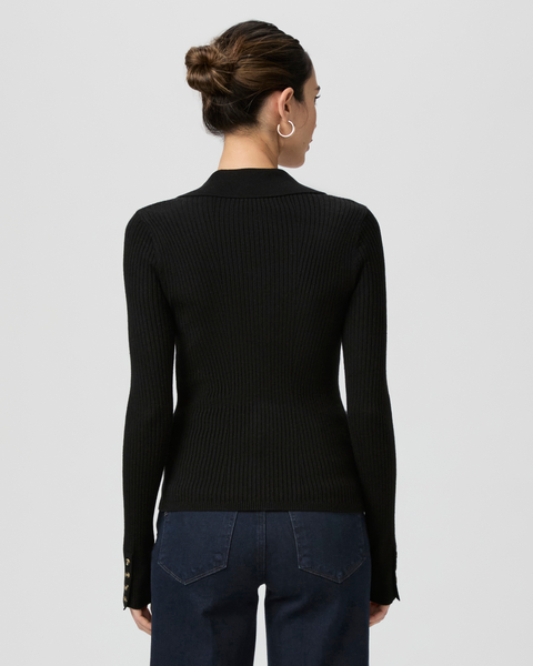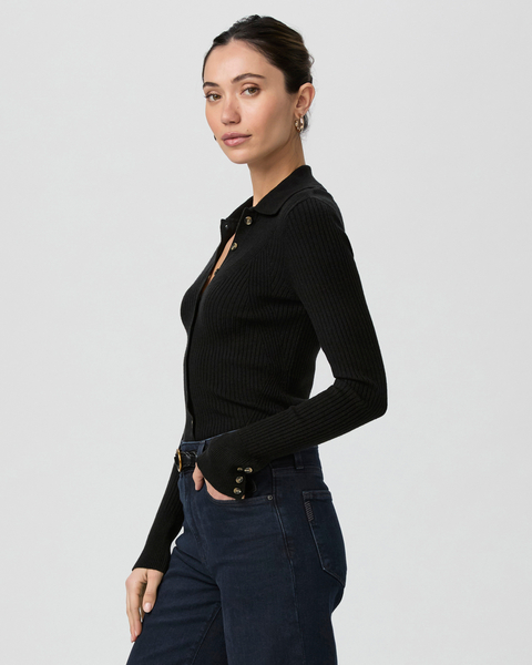 Crafted from a soft and comfortable black compact yarn, this long sleeve collared button down sweater top is designed with buttons at the sleeves and ribbed detailing. Pair the Jayde Top with any shade of denim.