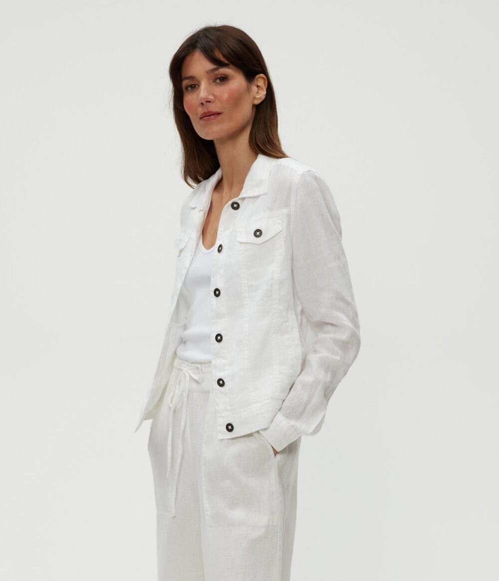 Jean is a lightweight, button-front jacket that hits just below the waist. Featuring seaming details throughout, it has a collared neck, optional buttons at the cuffs, and buttons at the bottom hem to customize the fit. Made from 100% biodegradable linen that is lightweight and breathable.