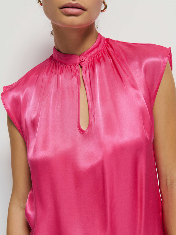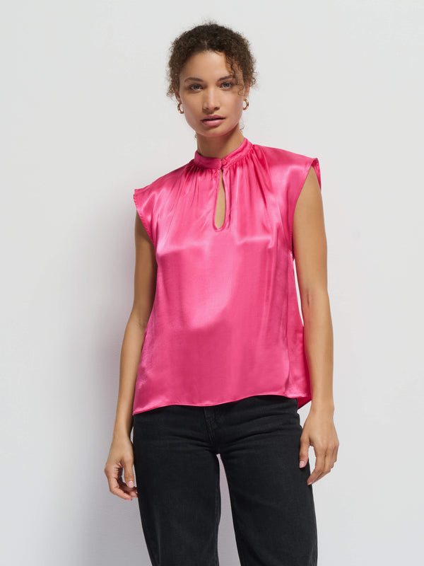 This perfect day-to-night top features a buttoned collar with a center keyhole and shirring details for the perfect amount of drape.