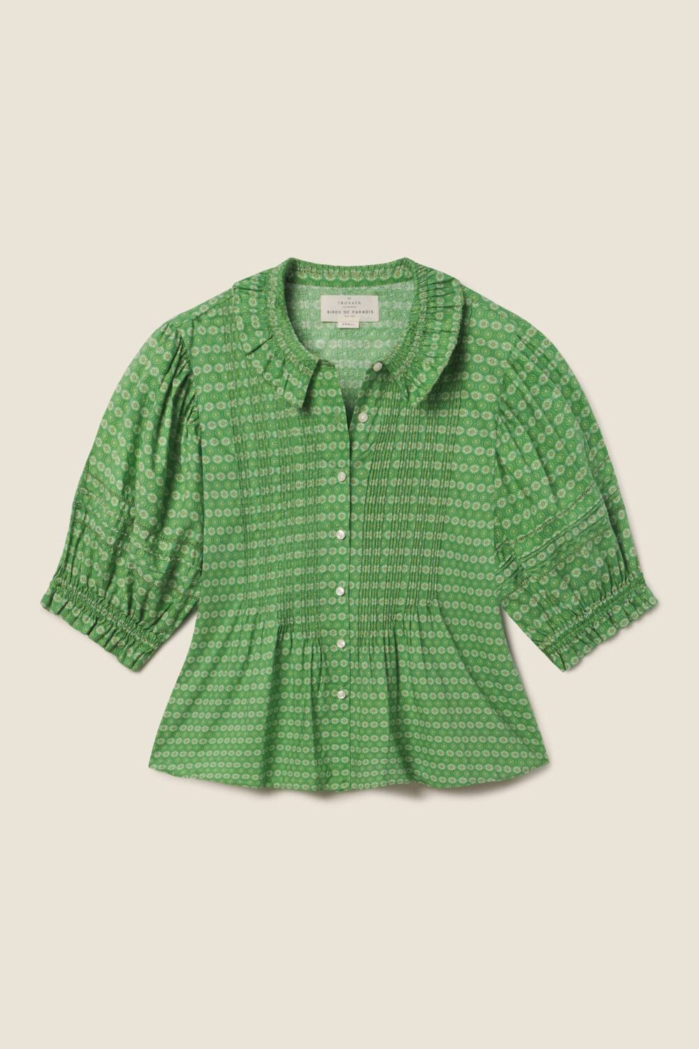 The Jess Blouse is Trovata’s newest short sleeve top. Designed to be self-styled, featuring a flattering curved hemline and petite pintucks that lend texture and hand crafted charm. Slightly cropped length keeps this blouse airy and whimsical. Shown here in Green Medallion and made from their soft cotton poplin.