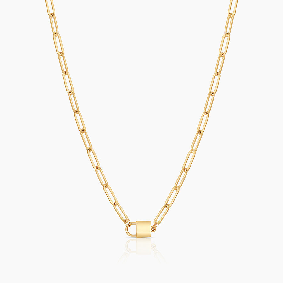 Lock your love down with this bestselling Jessa Necklace, featuring a delicate lock charm attached to our elongated Finn chain. Like your beloved childhood diary lock modernized, it’s a subtle choice for switching up your everyday jewelry look.