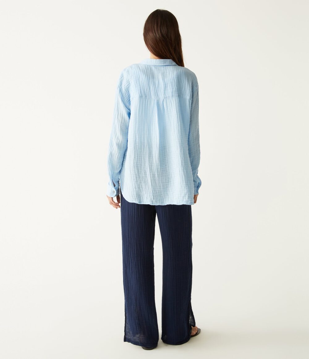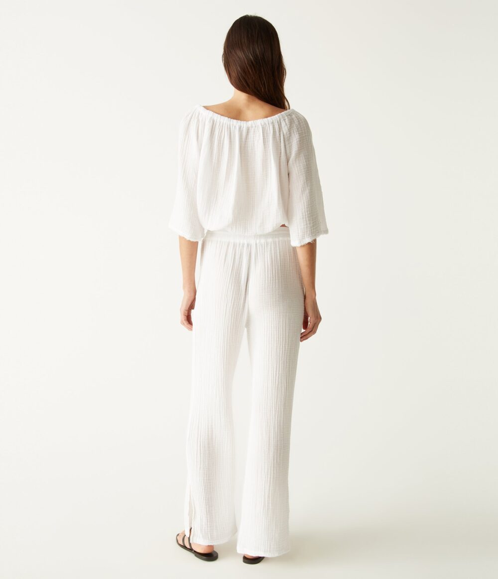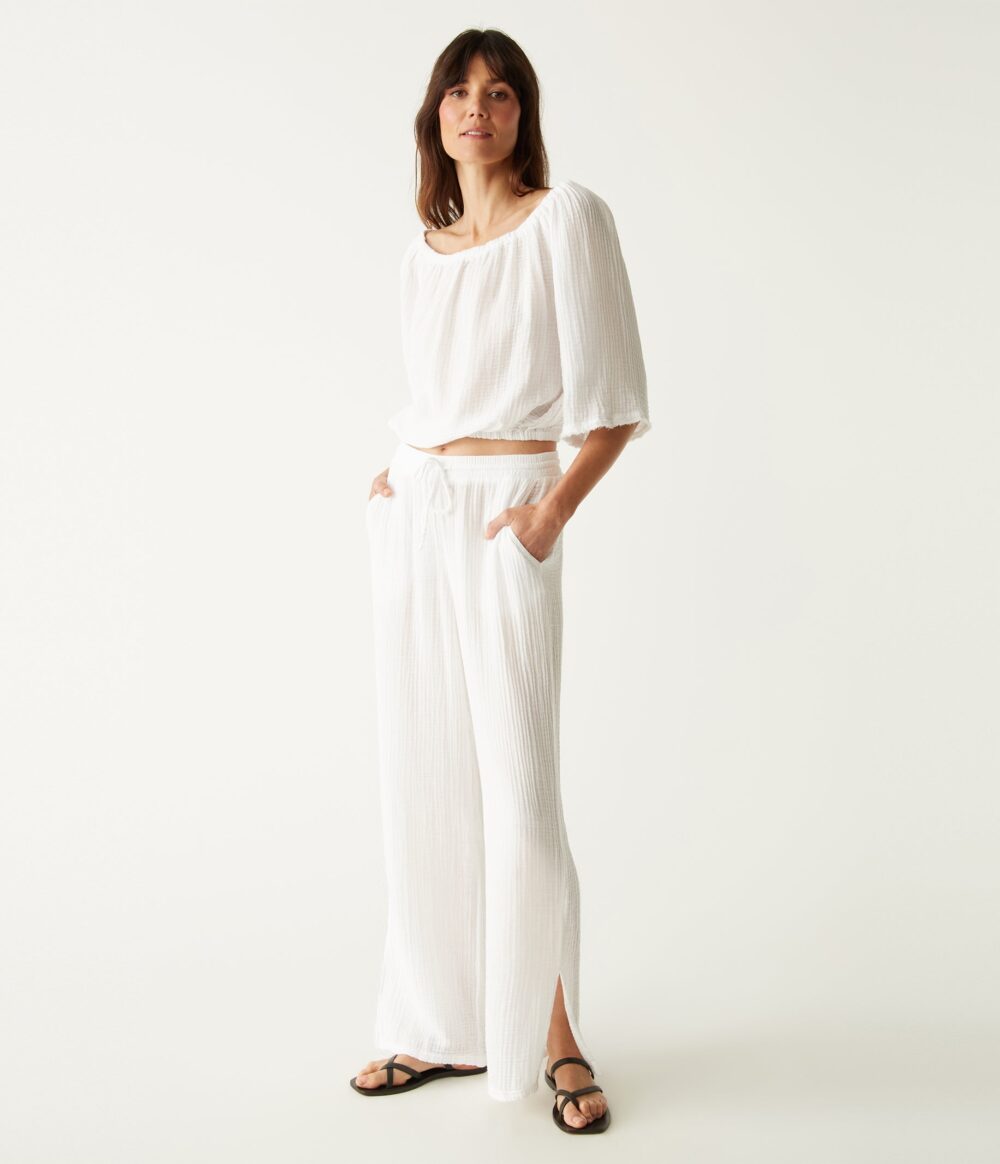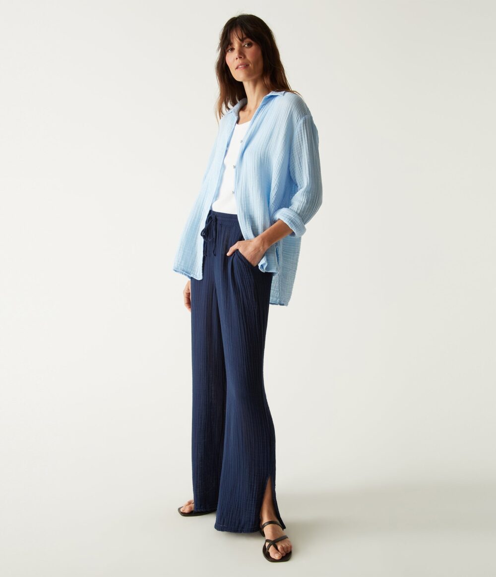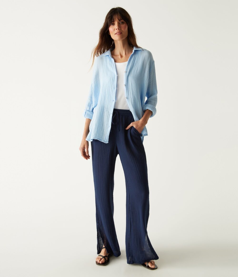 The Jovi pant is made from 100% cotton Double Gauze fabric and has a drawstring waist and straight leg with side slits at the ankles.